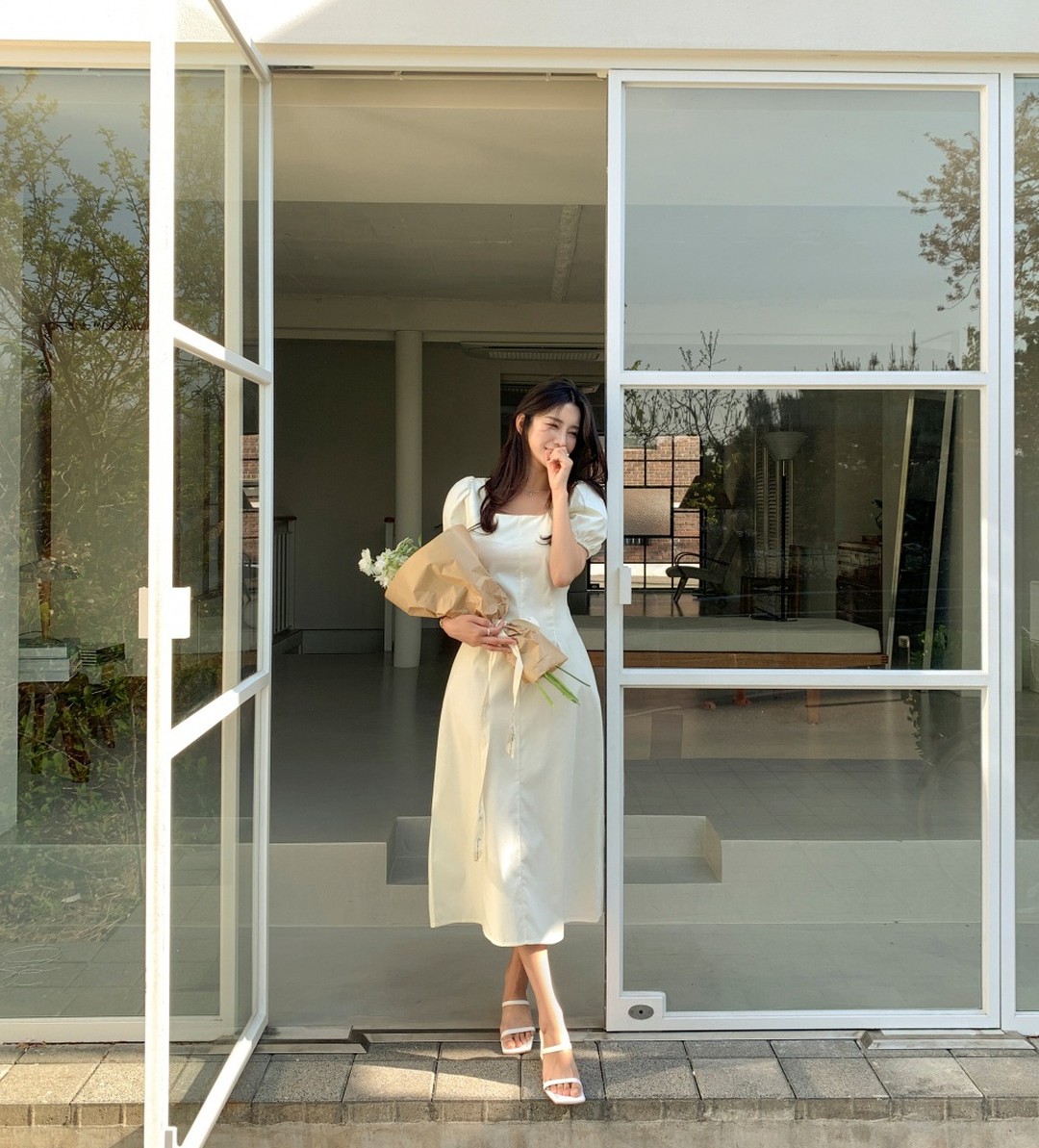 Các nàng nên ưu tiên váy tay bồng nhấn eo bởi lựa chọn này sẽ tạo sự chỉn chu cho phong cách, đồng thời tôn dáng cao ráo, thanh thoát hơn. Để set váy tay bồng nhấn eo thêm long lanh, sang trọng, chị em hãy tô điểm vòng cổ ngọc trai, dây chuyền vàng hoặc khuyên tai.