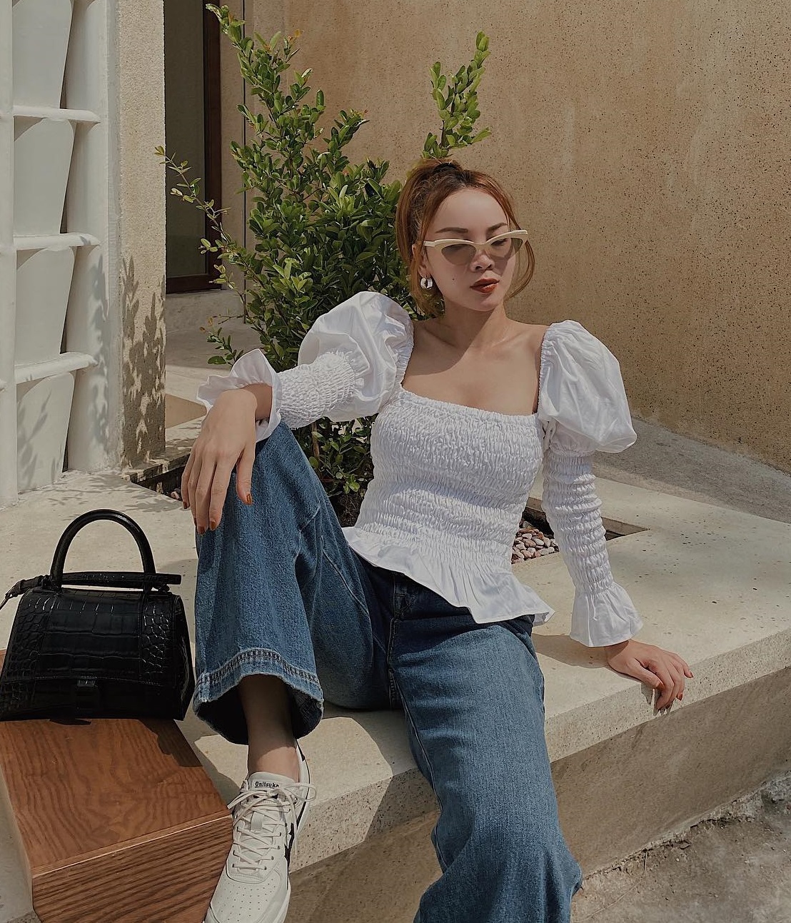 Áo blouse cũng rất phù hợp để diện với quần jeans. Kiểu áo này đem đến nét nữ tính, yêu kiều cho người diện. Các mỹ nhân Việt thường ưu tiên áo blouse trắng để kết hợp với quần jeans xanh. Bộ đôi này rất tươi trẻ, ngọt ngào nhưng vẫn có sự thanh lịch, phù hợp diện từ công sở ra phố.
