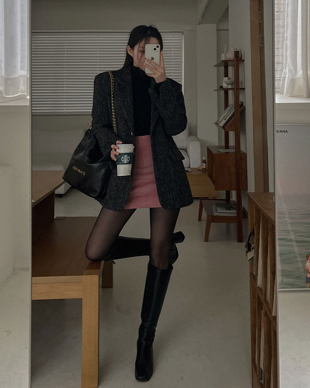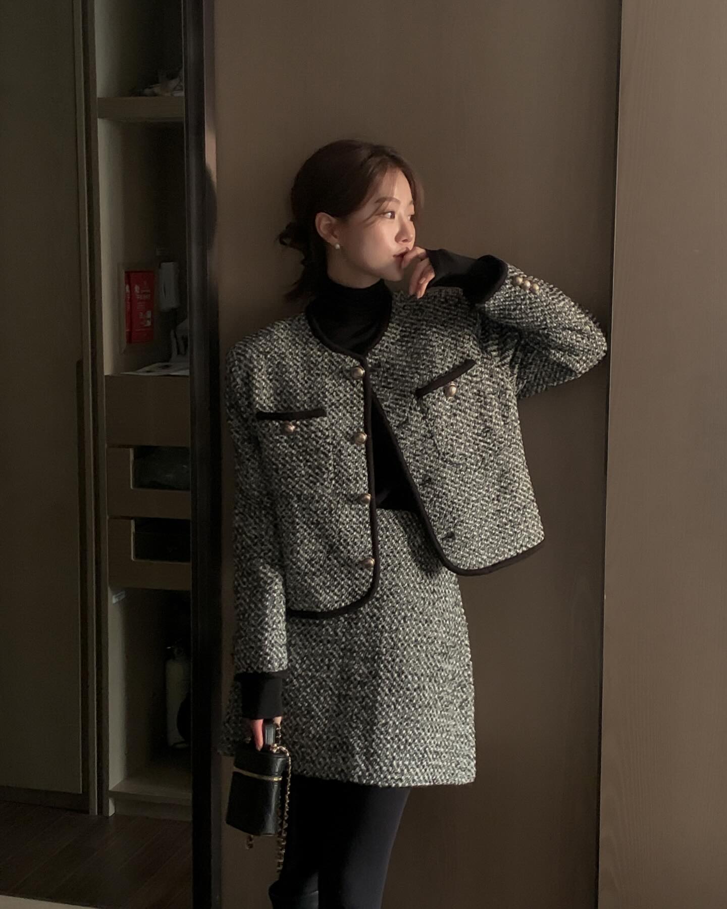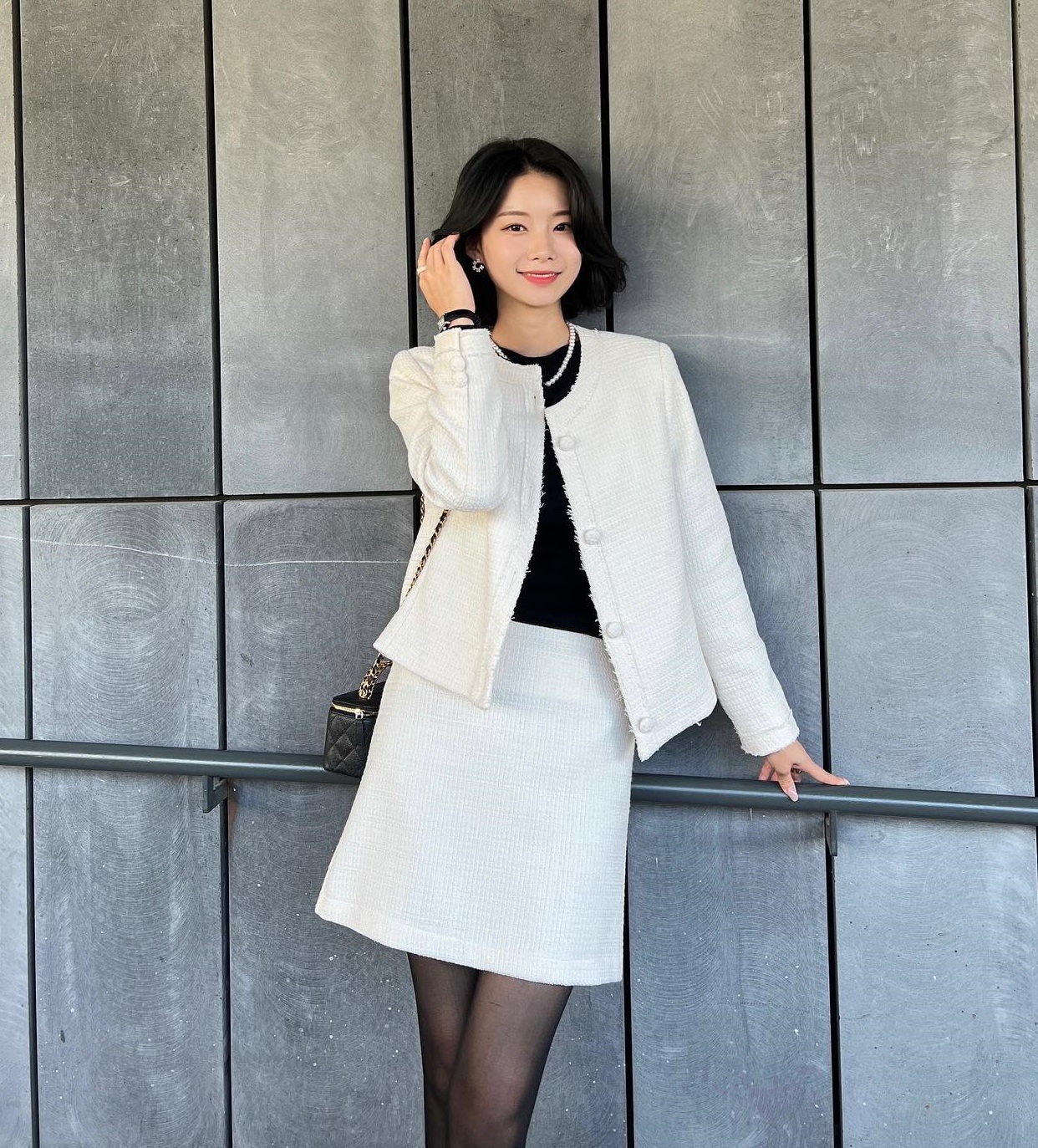 Để không phải suy nghĩ quá nhiều khi lên đồ, các nàng có thể chọn set áo khoác vải tweed và chân váy đồng bộ. Ngoài ra, nếu tô điểm cho set áo khoác + chân váy vải tweed một chiếc quần tất đen rồi đi giày cao gót mũi nhọn hoặc boots, tổng thể trang phục sẽ càng thêm quyến rũ, sang xịn mịn.