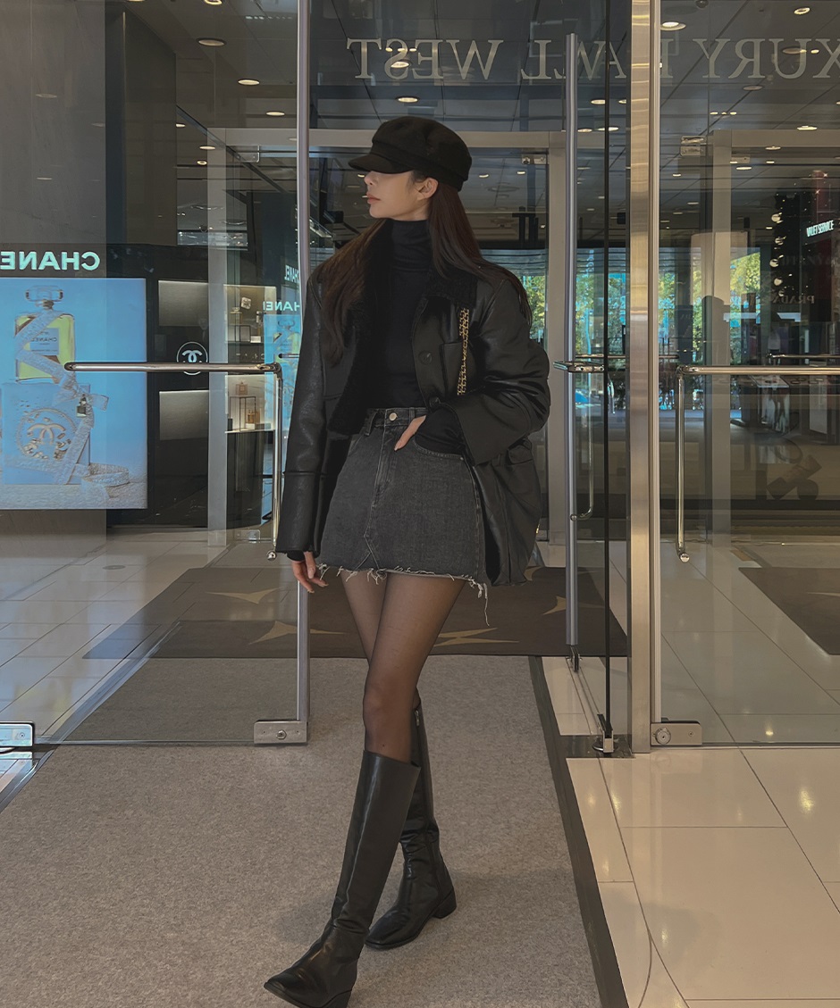Chị em đừng chỉ giới hạn phong cách dịp Tết trong những mẫu áo khoác đứng dáng. Kiểu áo bụi bặm như áo khoác da cũng là lựa chọn lý tưởng để kết hợp cùng chân váy. Dù có phong cách trái ngược nhưng áo khoác da vẫn ăn nhập với chân váy nữ tính, dịu dàng. Hai món thời trang này sẽ giúp vẻ ngoài của chị em thêm trẻ trung, nổi bật, đồng thời vẫn ghi điểm ngọt ngào, duyên dáng. Nếu ưu tiên áo khoác da dáng lửng, chiều cao của người diện còn được "ăn gian" hiệu quả.