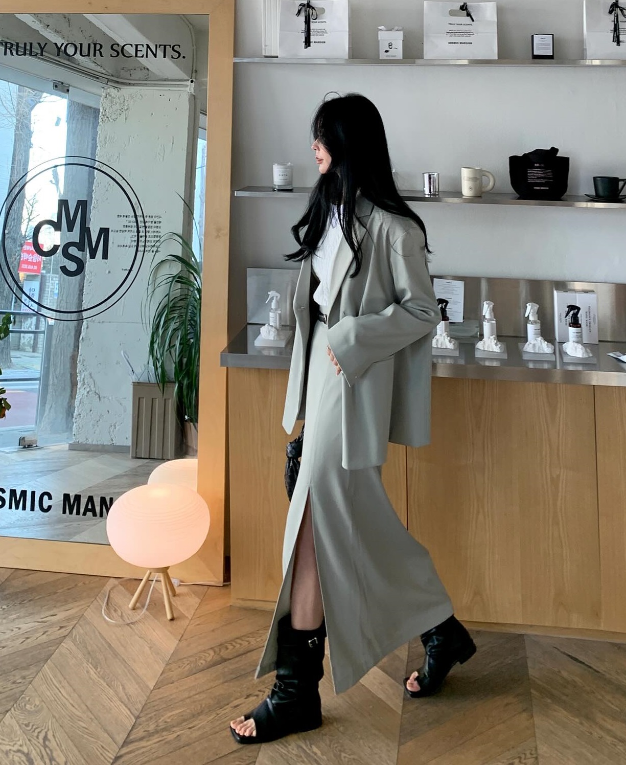 Áo blazer là biểu tượng của sự thanh lịch, sang trọng. Mẫu áo này có thể kết hợp với mọi món thời trang, trong đó có chân váy. Yêu thích sự đơn giản, chị em hãy chọn áo blazer màu trung tính rồi kết hợp với áo len/áo thun trơn và chân váy dài. Dù không cầu kỳ nhưng công thức này vẫn giúp người mặc ghi điểm với vẻ ngoài trang nhã, tinh tế.