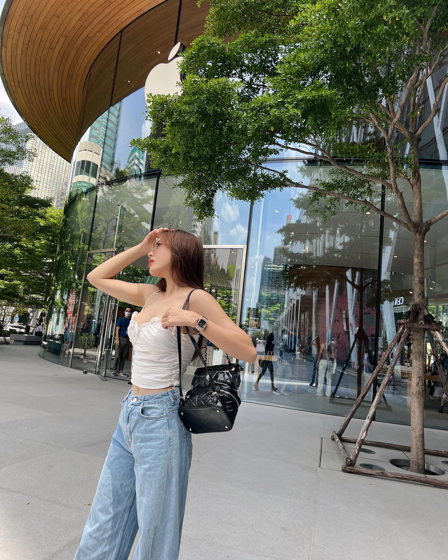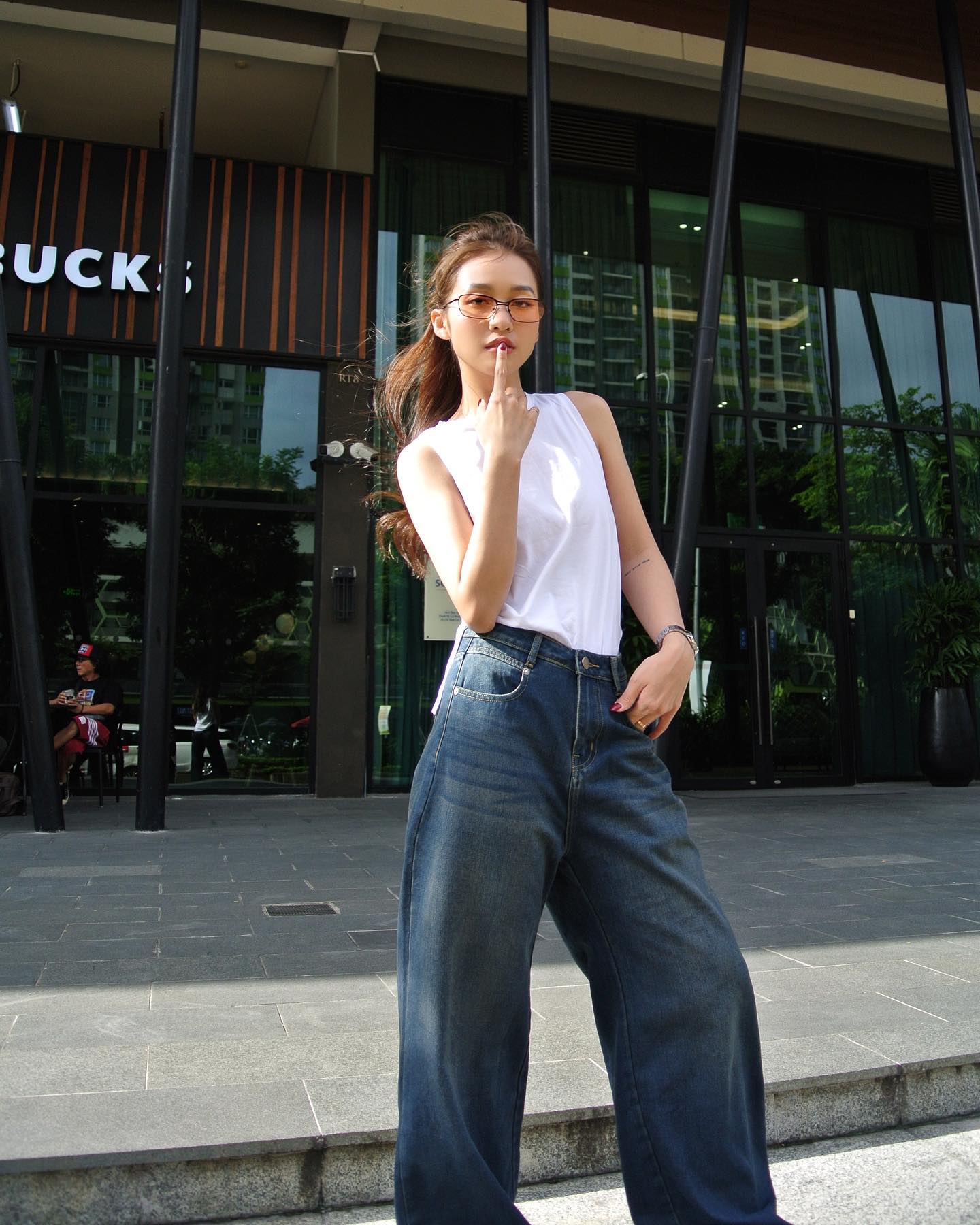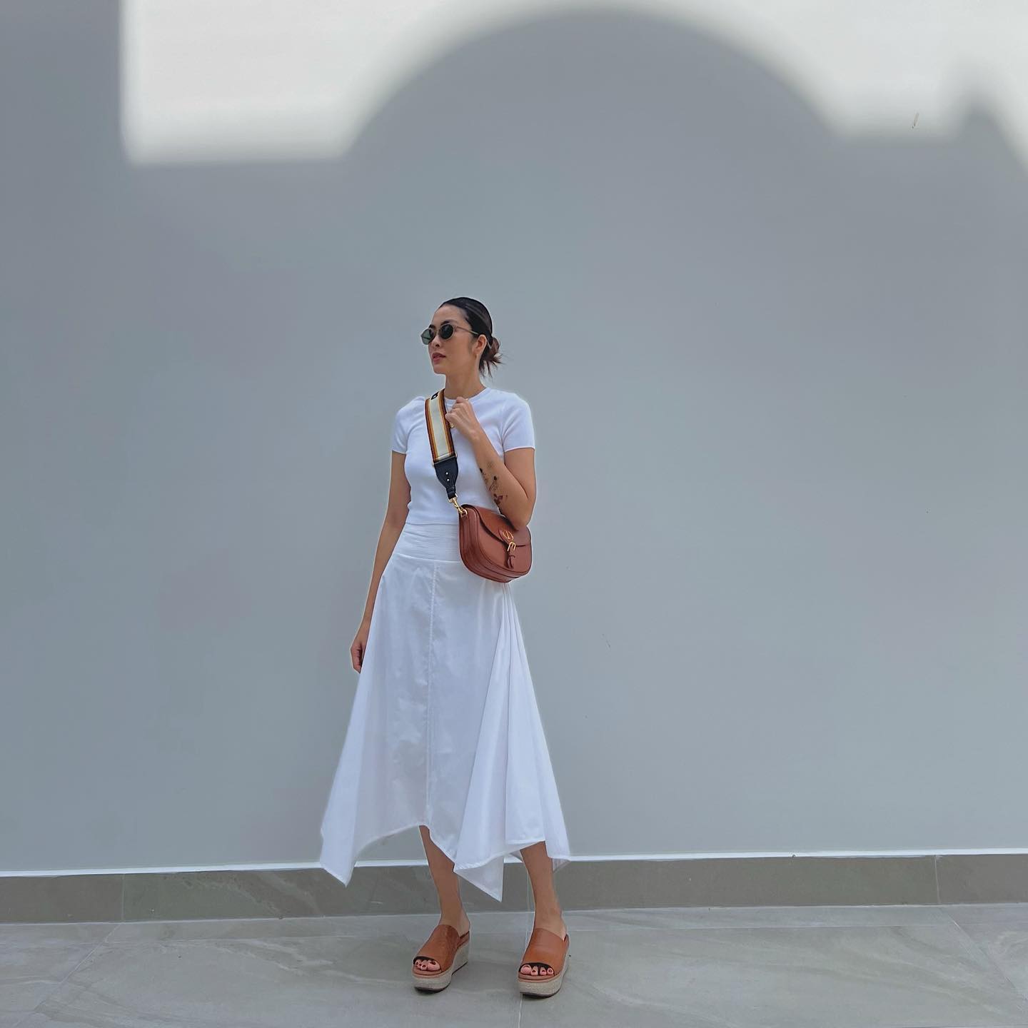 Áo thun trắng kết hợp ăn ý với quần jeans xanh, chân váy dài, giúp người mặc có tổng thể trang phục sành điệu, trẻ trung. Để tăng hiệu quả "hack" dáng, chị em nên sơ vin gọn gàng khi diện áo thun trắng.