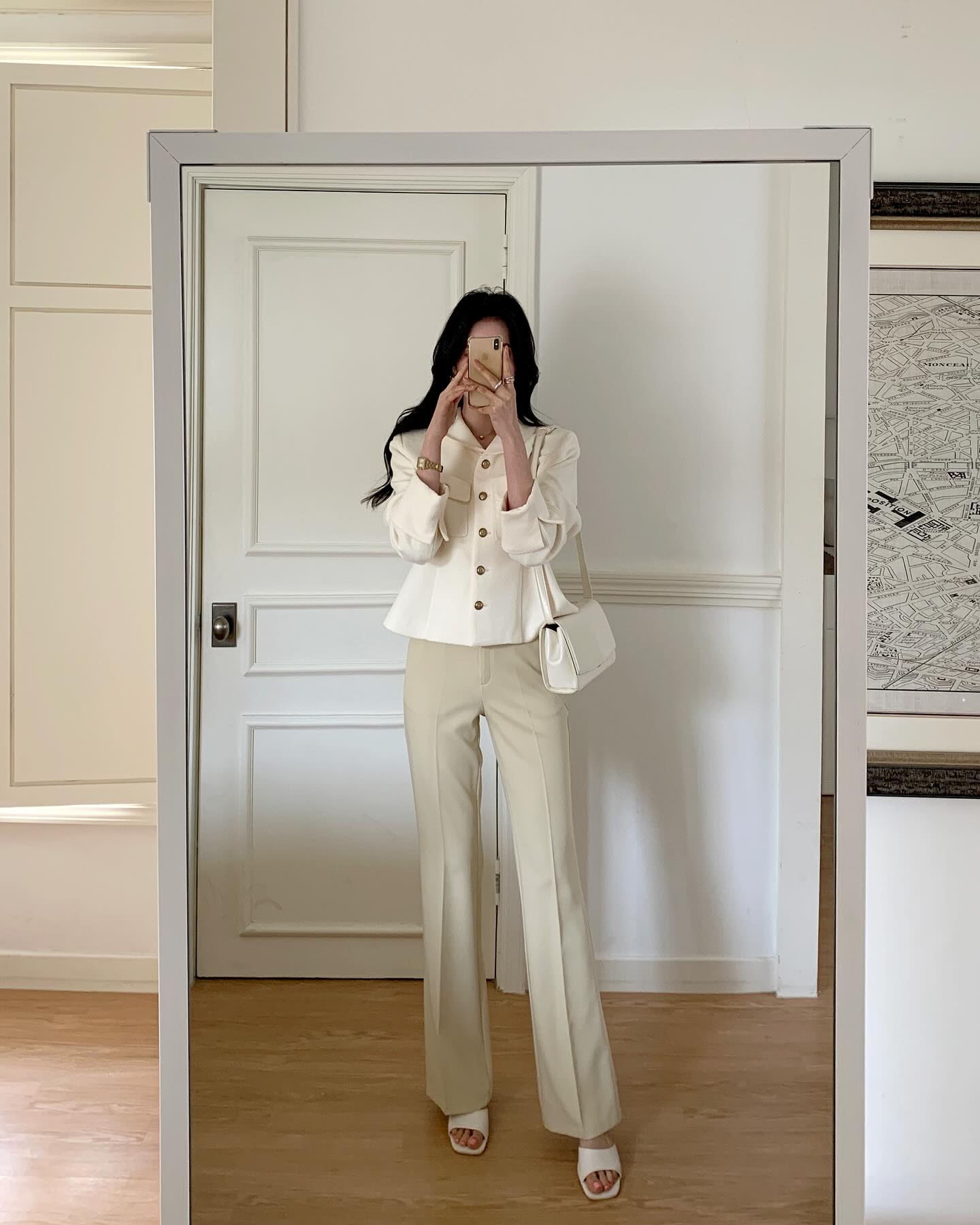 Quần âu là mảnh ghép quan trọng của những bộ trang phục công sở. Thay vì chọn quần âu tối màu, phụ nữ trên 40 tuổi nên làm mới thời trang đi làm với quần âu sáng màu. Các quý cô 40+ có thể biến hóa với quần âu màu trắng, be hoặc pastel ngọt ngào.