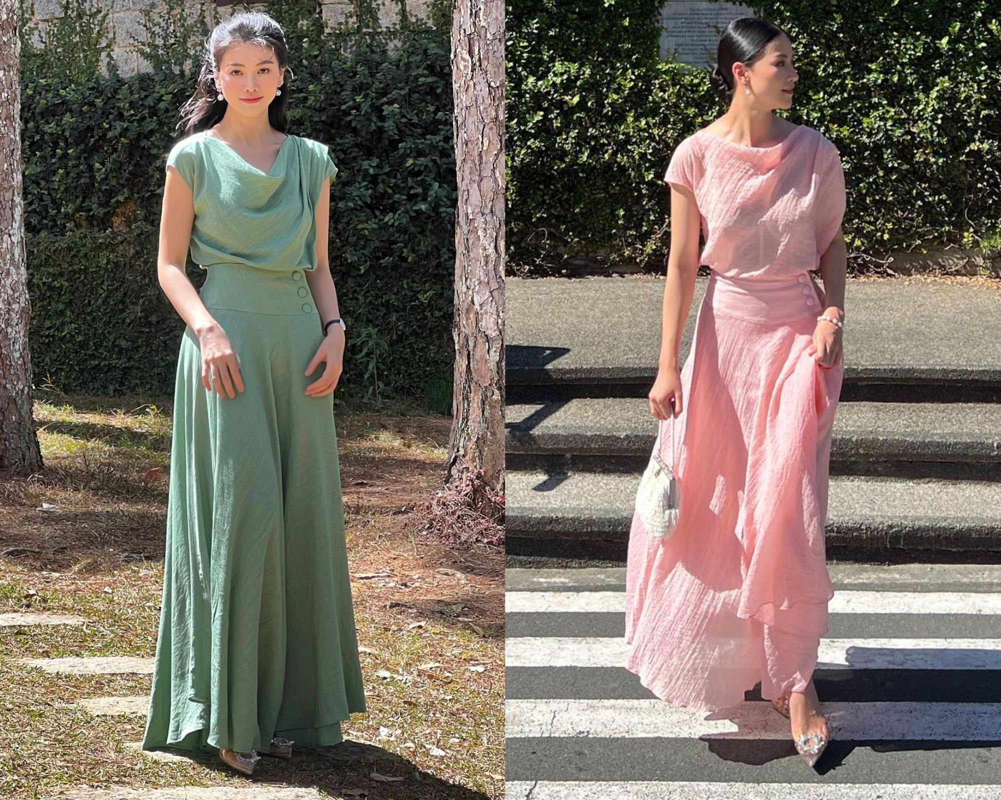 Thời trang đi ăn cưới của Hoa hậu Phương Khánh cũng khiến dân tình phải mê mẩn. Nàng hậu không giới hạn phong cách trong những tông màu trầm. Trái lại, cô rất ưu ái những thiết kế váy mang tông màu tươi tắn, ngọt ngào như xanh lá, hồng nhạt… Nhờ vậy, vẻ ngoài của Phương Khánh có nét rạng rỡ, bay bổng nhưng vẫn ghi điểm tinh tế.