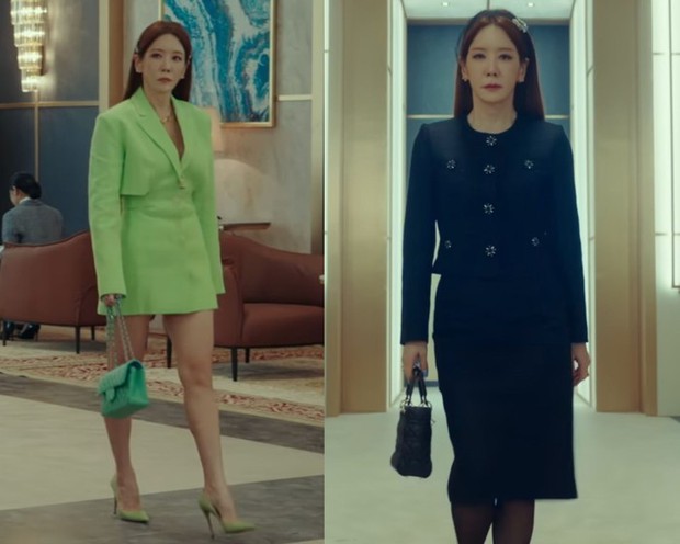 Nữ chính phim "Chuyện tình Paris" gây sốt một thời đã tái xuất màn ảnh nhỏ với bộ phim "Cô nàng mạnh mẽ Gang Nam Soon". Cô áp dụng phong cách sang trọng, đúng chất thượng lưu. Những bộ suit, váy liền dáng dài hay áo trench coat, blazer là các món thời trang phủ sóng phong cách của nữ diễn viên U50. Loạt trang phục của Kim Jung Eun đều toát lên sự long lanh, sang xịn mịn nhưng vẫn trẻ trung và nhiều màu sắc. Thêm một điều ấn tượng nữa, đó là các set đồ đã làm tốt nhiệm vụ tôn lên vóc dáng thon gọn, nuột nà của Kim Jung Eun.