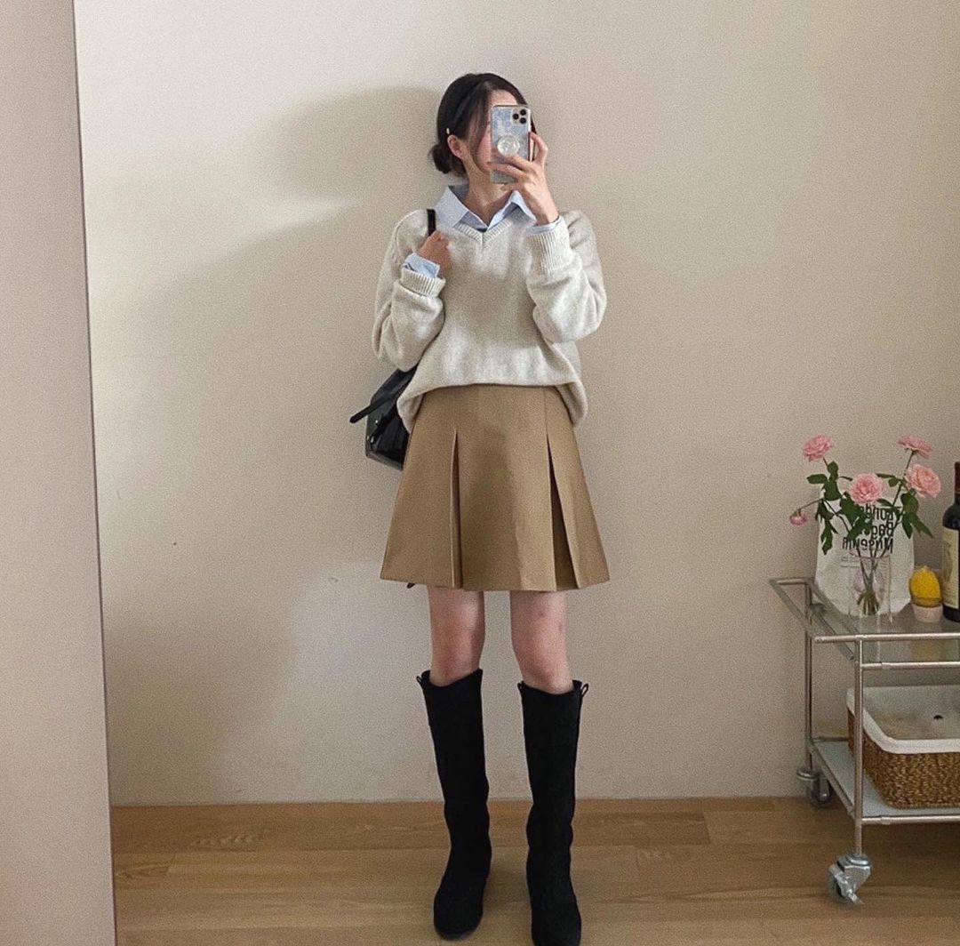 Một cách hiệu quả để giữ ấm cho chân là kết hợp váy với tất cao cổ. Tất và boots cao cổ không chỉ làm ấm chân mà còn tạo nên điểm nhấn thời trang độc đáo. Bạn có thể chọn tất và boots cao cổ màu đen hoặc nude để dễ dàng kết hợp với nhiều loại váy khác nhau.