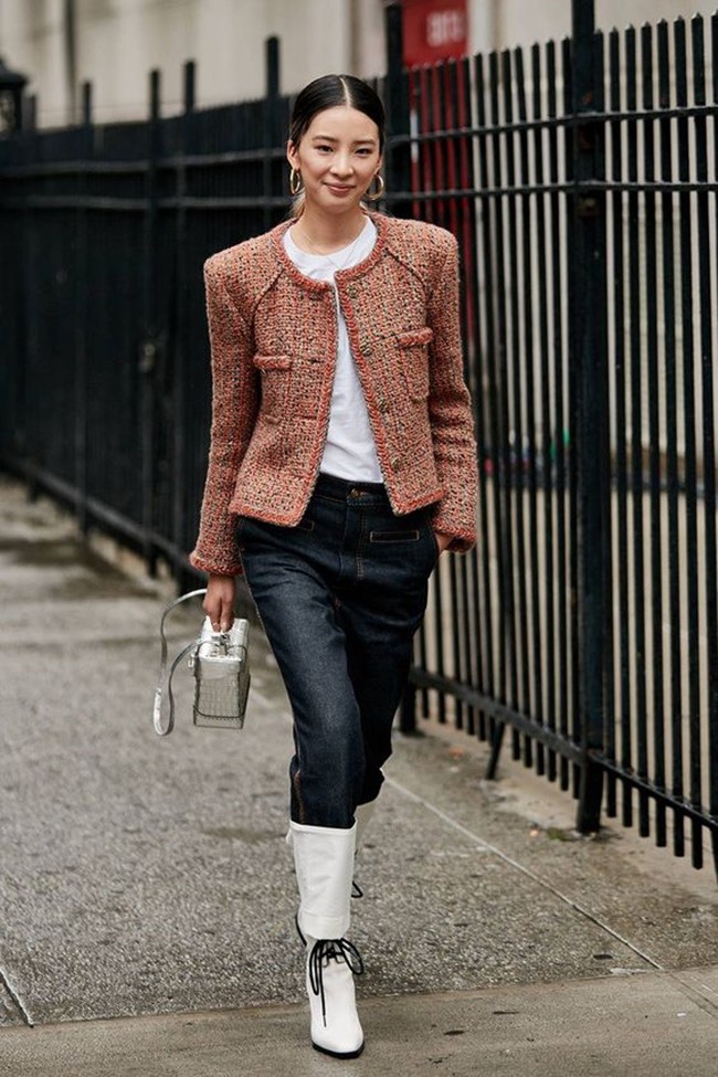 Tweed là chất liệu có khả năng sang trọng hóa mọi item, trong đó có áo phông. Kết hợp áo phông trắng với áo khoác tweed biến bạn thành quý cô thanh lịch, sang chảnh trong một nốt nhạc. Để khiến bộ trang phục thêm ấn tượng, hãy chọn áo khoác màu sắc đối nghịch với áo phông. Cách mix tuy không cầu kỳ song mang lại cho bạn gái vẻ ngoài trưởng thành nhưng vẫn tươi trẻ. Với công thức này, bạn gái có thể chọn quần hoặc chân váy đi cùng tùy ý, miễn tối giản về màu sắc.