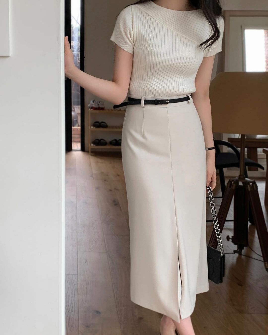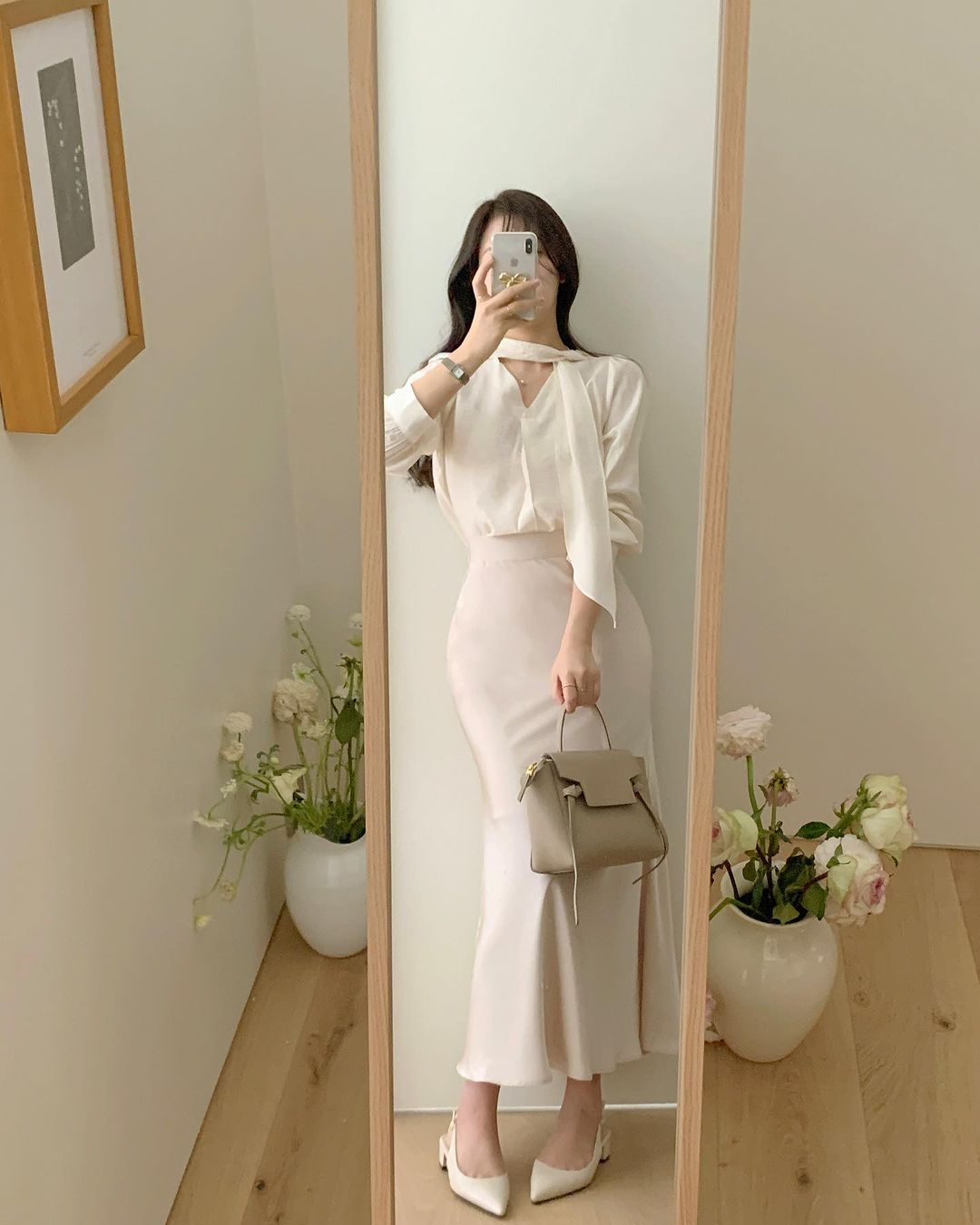 Chân váy dài dáng ôm mang đến vẻ quyến rũ và gợi cảm. Kiểu chân váy này sẽ tôn lên đường cong gợi cảm ở eo và hông, ghi điểm thu hút cho chủ nhân. Khi tới sở làm, bạn nên chọn những mẫu chân váy ôm có chất vải cứng cáp, tránh gợi cảm quá đà.