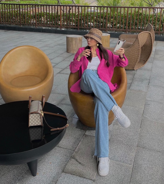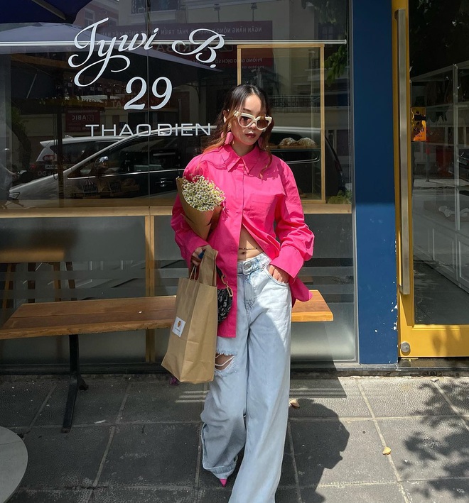 Áo sơ mi hồng đậm không hề "sến" như nhiều nàng vẫn tưởng. Mẫu áo này được các mỹ nhân Việt ưa chuộng từ mùa hè sang thu. Khi kết hợp áo sơ mi hồng đậm với quần jeans xanh, hiệu quả "hack" tuổi sẽ được nhân đôi. Cách phối đồ này không chỉ giúp Phạm Thanh Hằng và Yến Trang có được vẻ ngoài trẻ trung hơn tuổi, mà còn cộng thêm điểm sang trọng, lung linh cho người mặc.