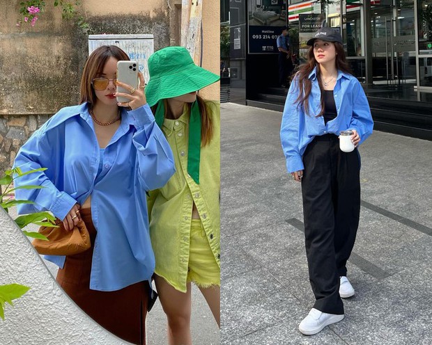Áo sơ mi xanh "phủ sóng" phong cách của các mỹ nhân Việt trong năm nay. Mẫu áo này là "bảo chứng" cho vẻ ngoài trẻ trung, tươi tắn. Các nàng có thể biến hóa từ áo sơ mi xanh nhạt sang phiên bản xanh đậm. Sự thay đổi này giúp phong cách thêm đa dạng. Nếu như áo sơ mi xanh nhạt có nét hiền hòa và trang nhã, thì áo sơ mi xanh đậm cá tính, nổi bật hơn. Có nhiều cách để chị em mặc đẹp với áo sơ mi xanh. Ngoài công thức sơ mi xanh kết hợp với quần dài/chân váy, các nàng có thể diện mẫu sơ mi này như một chiếc áo khoác ngoài, để phong cách thêm phóng khoáng, thời thượng.