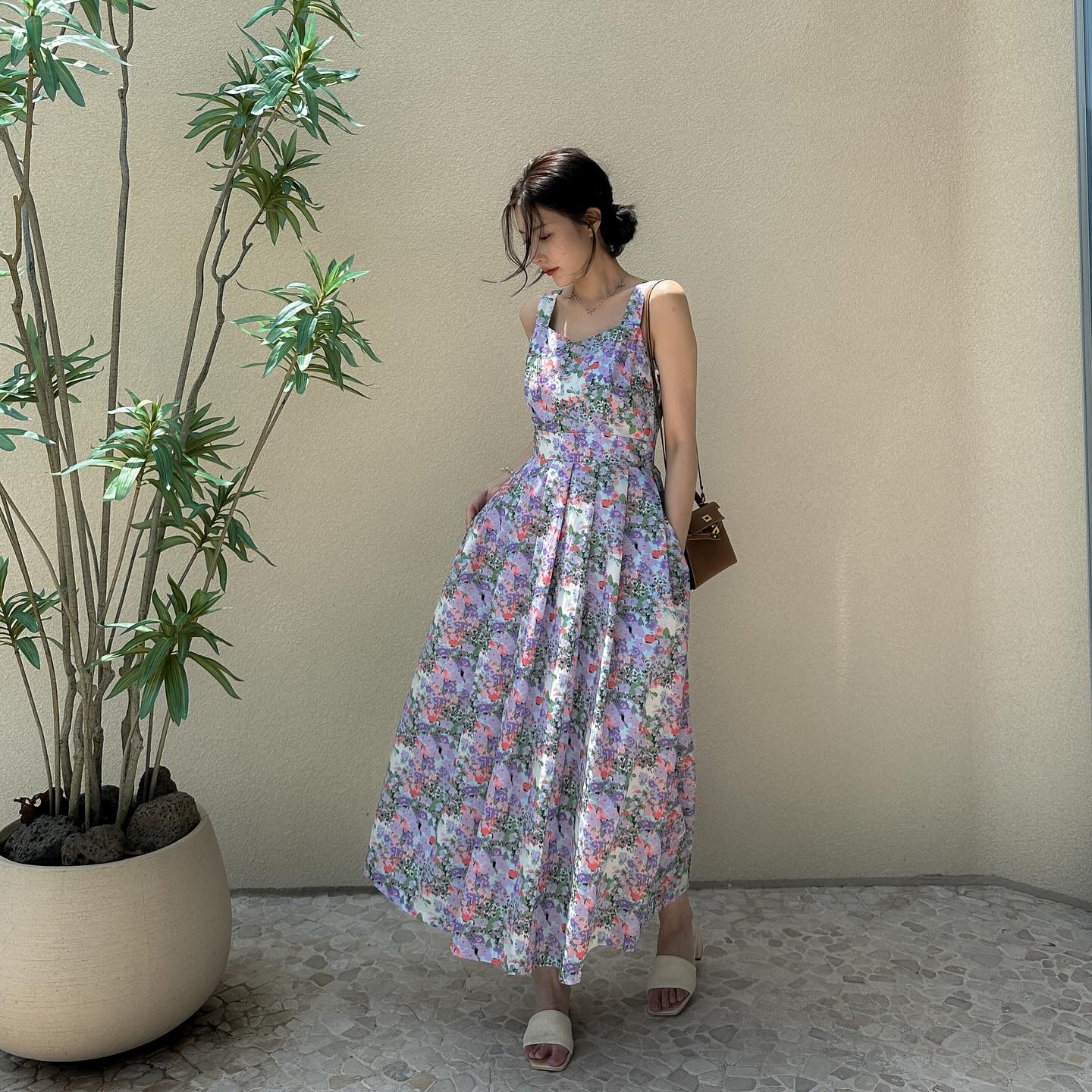 Để có được vẻ ngoài sang trọng khi diện váy hoa, chị em nên ưu tiên mẫu váy có thiết kế tay bồng, cổ vuông/cổ chữ V. Chị em hãy hoàn thiện các set váy hoa bằng những món đồ màu trung tính để đảm bảo sự hài hòa cho cả tổng thể.