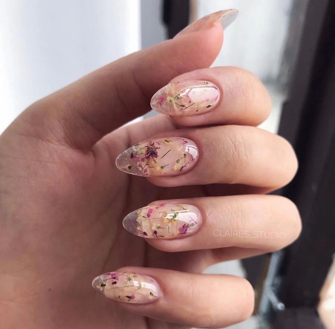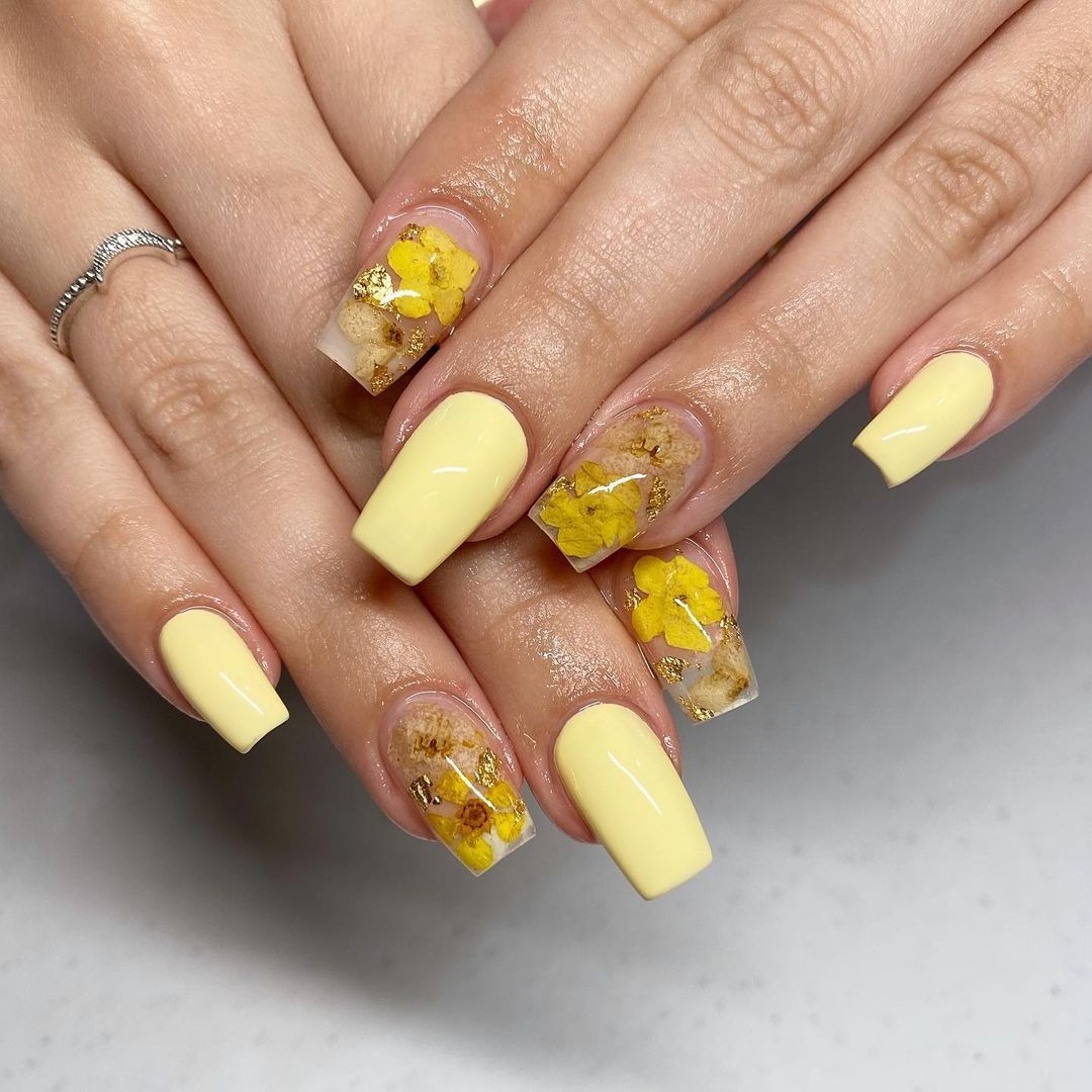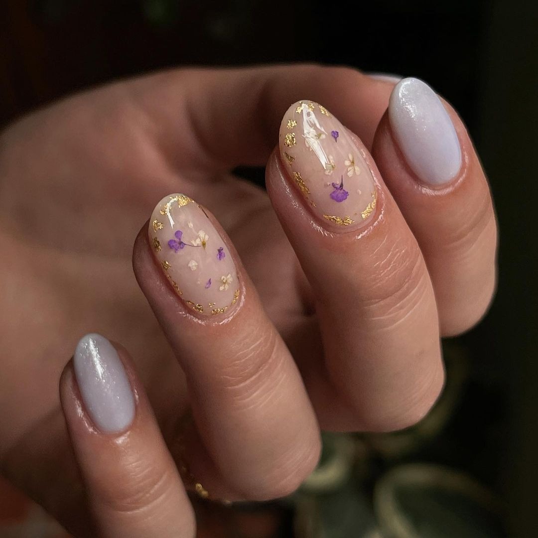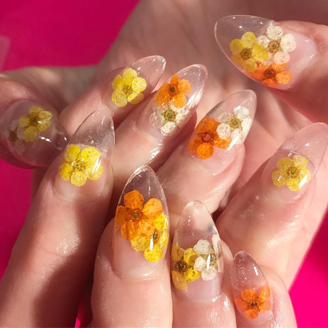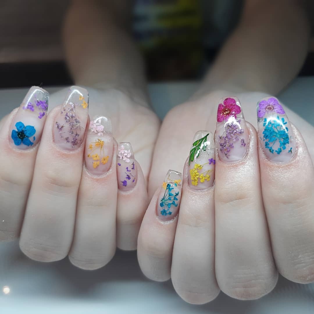 Với nền móng trong suốt, bạn có thể lựa chọn những bông hoa khô có kích thước lớn hơn, màu sắc rực rỡ hơn mà không lo màu hoa bị nhấn chìm so với màu nền của móng tay. Hãy tưởng tượng những lớp thạch trong suốt với những bông hoa đủ màu bung nở. Một cảm giác tươi mới rực rỡ như mùa Xuân.