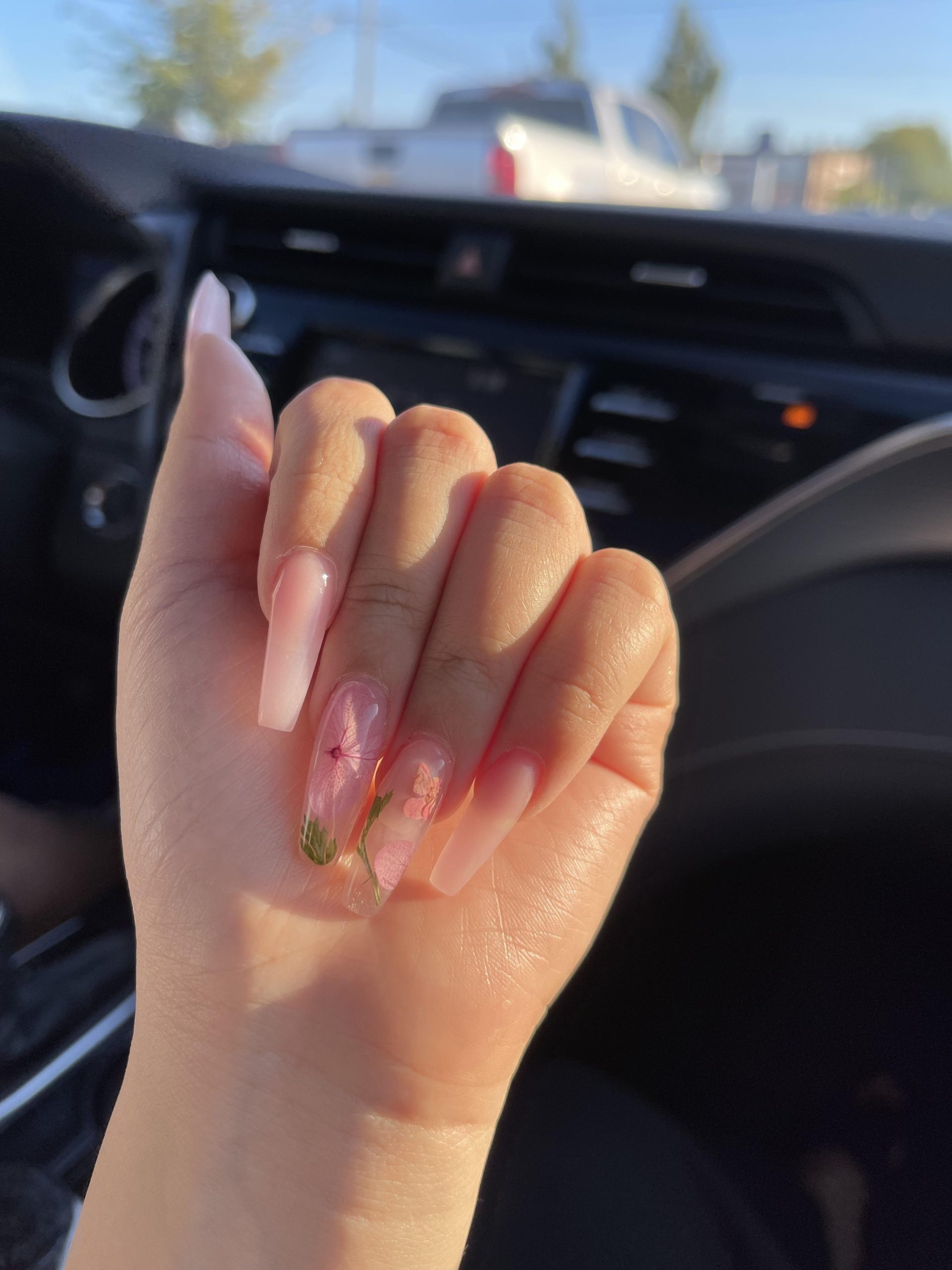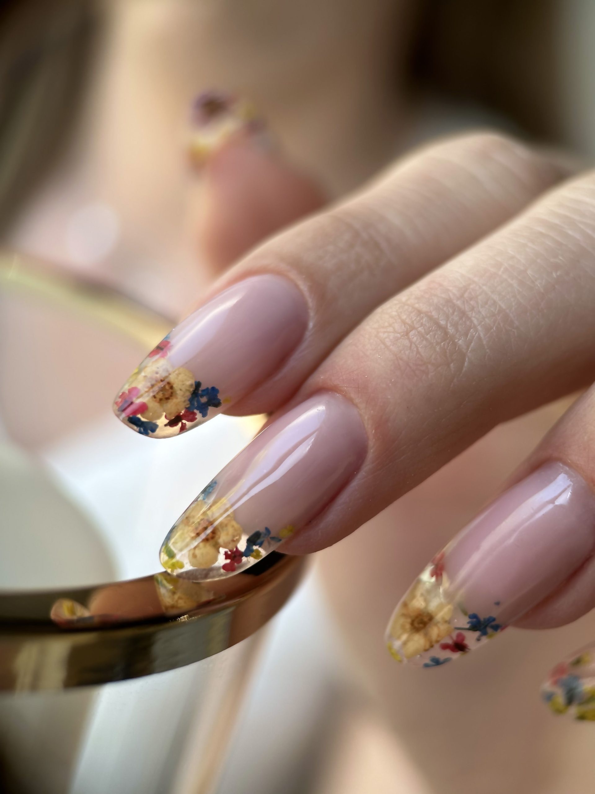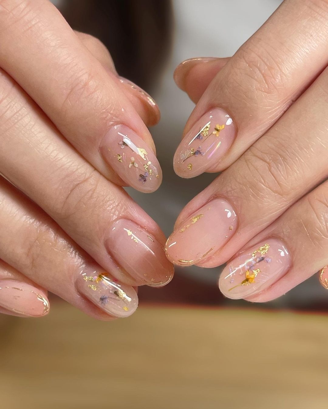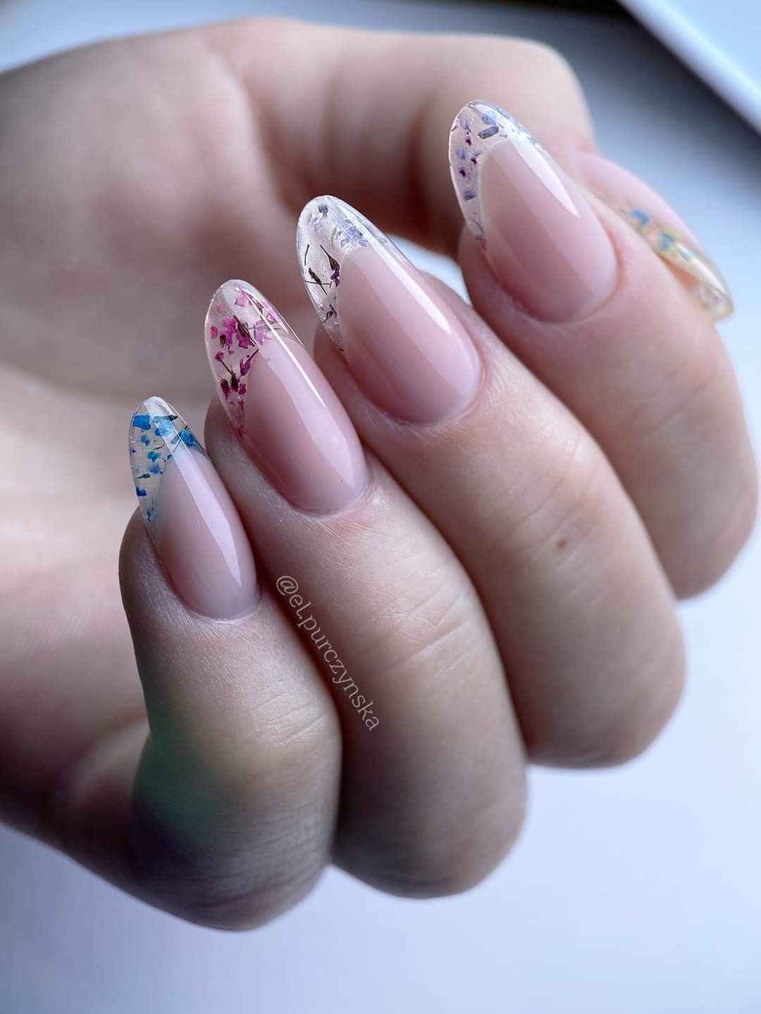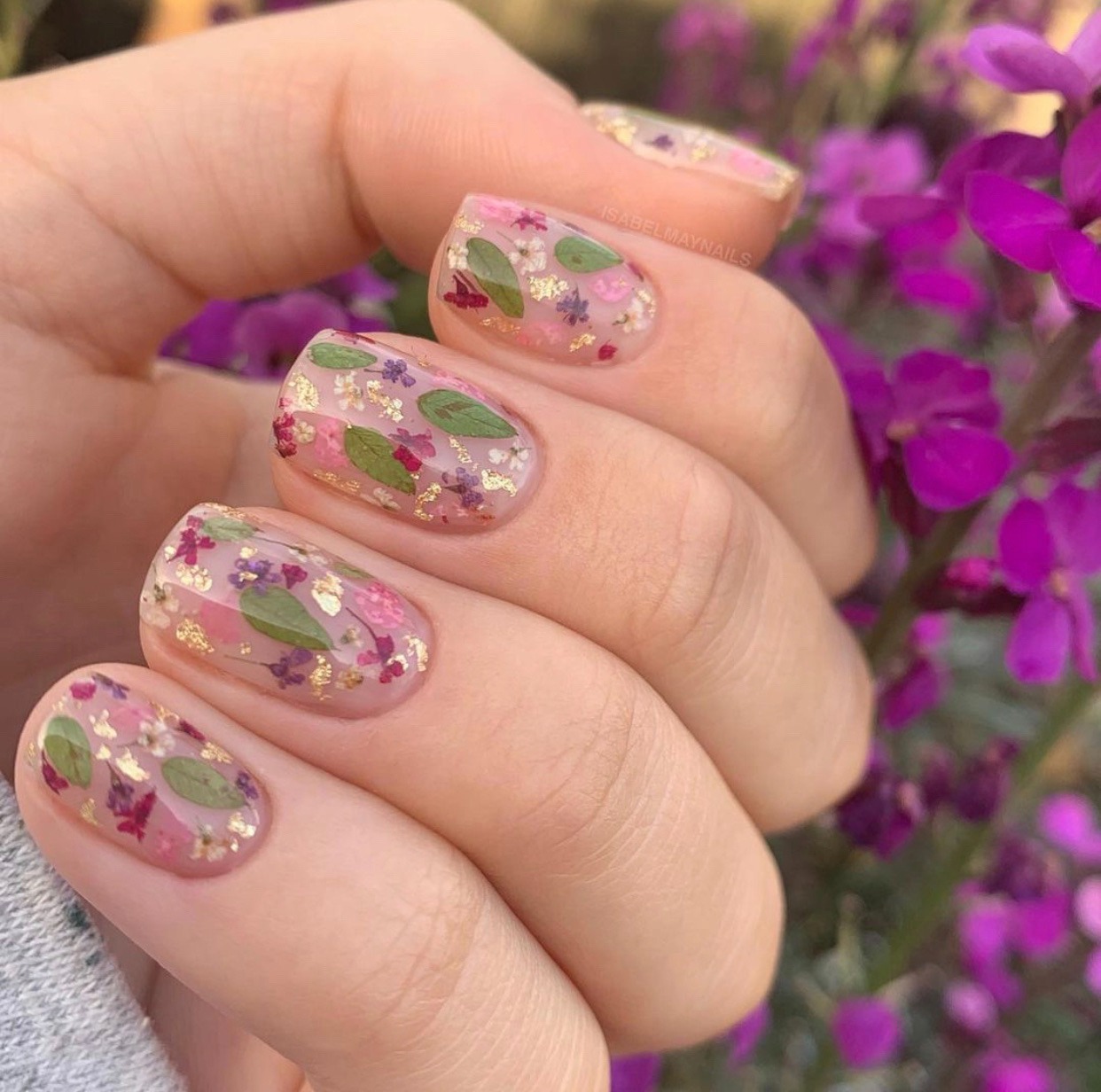 Với nền móng trong suốt, bạn có thể lựa chọn những bông hoa khô có kích thước lớn hơn, màu sắc rực rỡ hơn mà không lo màu hoa bị nhấn chìm so với màu nền của móng tay. Hãy tưởng tượng những lớp thạch trong suốt với những bông hoa đủ màu bung nở. Một cảm giác tươi mới rực rỡ như mùa Xuân.