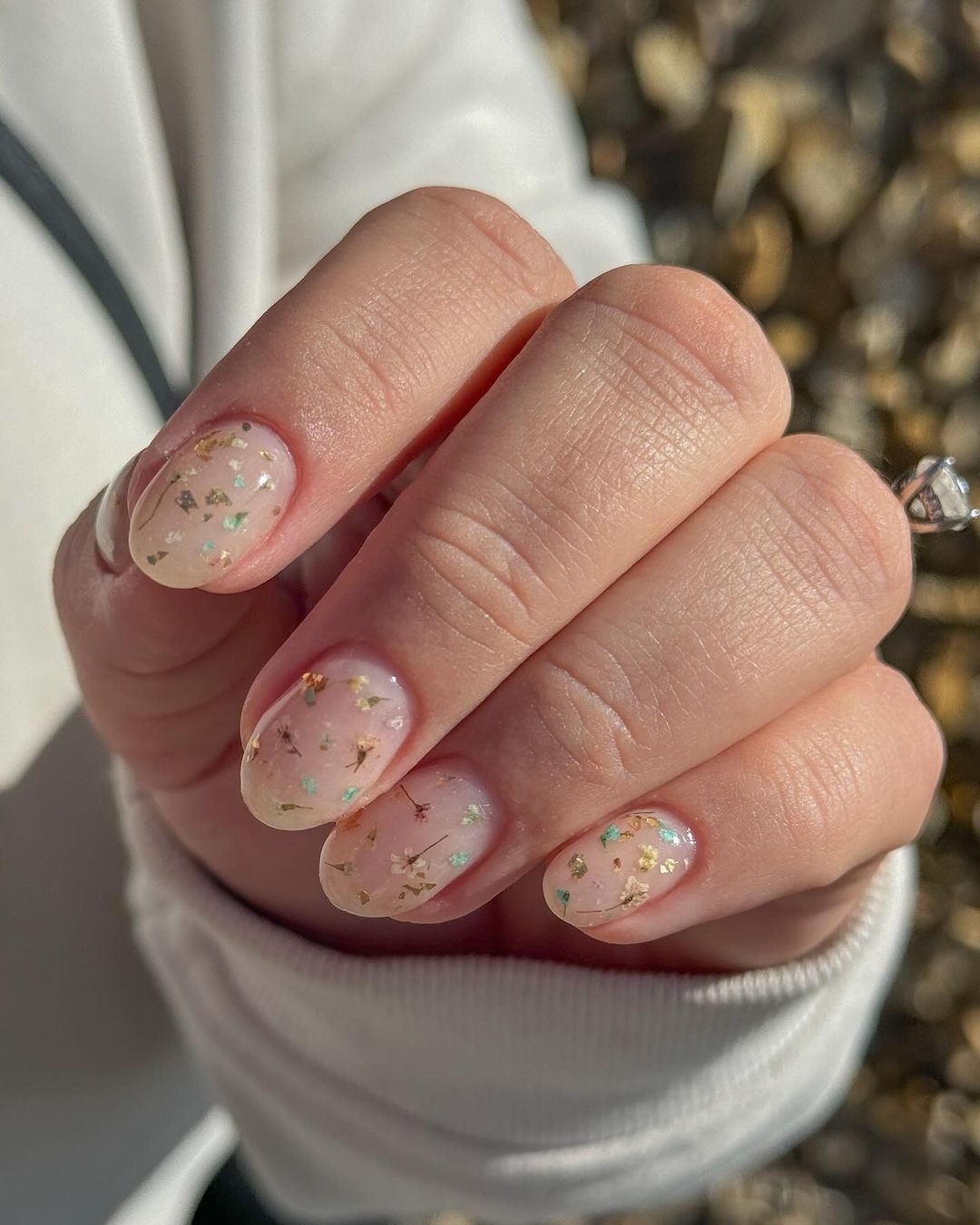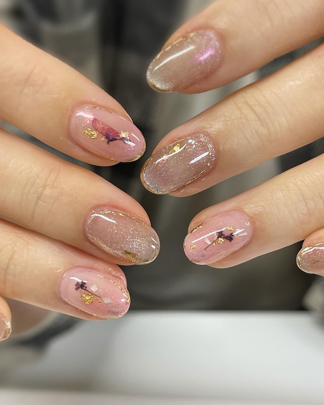 Móng tay hoa khô, hay kiểu móng tay “ẩn hoa khô”, là xu hướng sử dụng các loại hoa hoặc lá cây được sấy khô và ép mỏng để làm họa tiết trang trí trên móng tay. Các cánh hoa có thể là hoa thật hoặc hoa nhân tạo được đính lên lớp sơn, thường là những màu trung tính như màu hồng nude, màu beige nhạt, tạo nên hình ảnh tinh tế và rất nữ tính trên bàn tay.