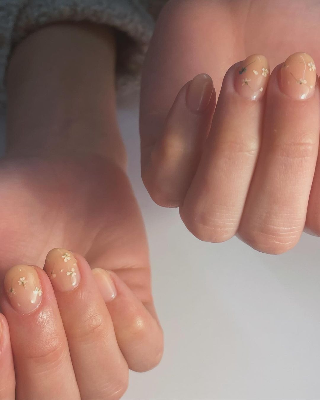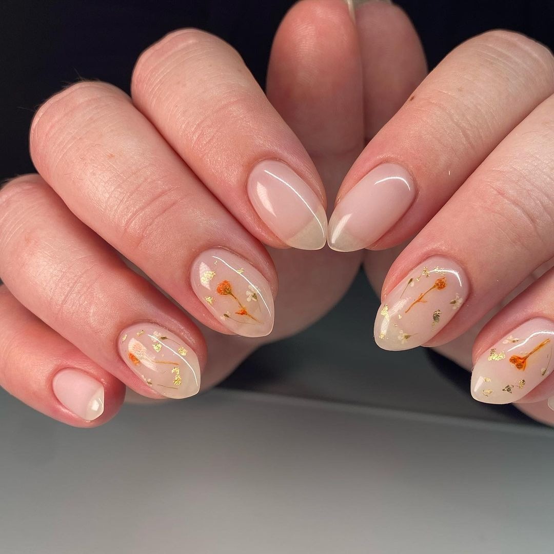 Nếu là tín đồ của phong cách tối giản minimalism, chắc hẳn bạn sẽ rất thích kiểu móng tay hoa khô trên nền móng màu nude dịu dàng. Móng tay được cắt giũa không quá dài trước khi sơn màu nền, sau đó những bông hoa nhỏ li ti, những cành lá thanh mảnh được rải đều trên móng. Những bông hoa trắng nhạt thường được ưa chuộng nhất, nhưng bạn có thể chọn bất cứ màu hoa gì cho kiểu móng này.