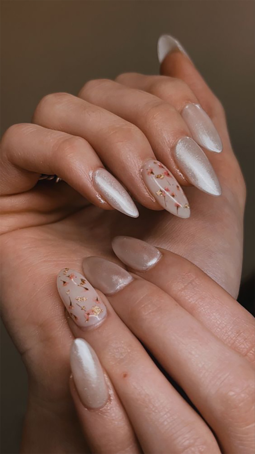 Bạn cũng có thể kết hợp đính hoa khô với màu sơn mắt mèo hoặc tráng gương, một mũi tên trúng… cả hai xu hướng làm đẹp của năm nay. Các chuyên gia làm móng thường sẽ khuyên giũa hình móng thuôn dài, hơi nhọn ở phần đầu móng để tăng thêm vẻ ấn tượng, sắc sảo của kiểu móng này.
