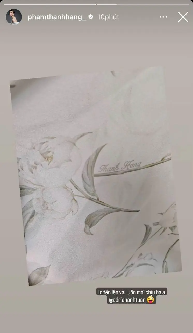 Trước ngày trọng đại, Thanh Hằng đã hé lộ một bức ảnh với hình hoa mẫu đơn mảnh mai in trên nền vải trắng. Cô còn tag tên NTK Adrian Anh Tuấn - một người bạn thân lâu năm của Thanh Hằng, từ đó bùng nổ đồn đoán về mẫu váy cưới mà "chị đại" diện có thể sẽ là thiết kế của NTK Adrian Anh Tuấn.