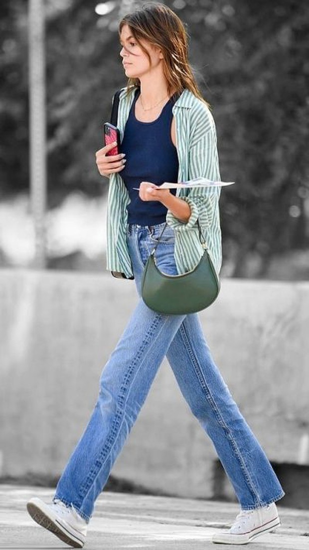 Cùng một chiếc quần jeans ống đứng, Kaia có thể biến tấu diện mạo của bản thân với vô vàn phong cách thời trang khác nhau. Chỉ cần phối thêm chiếc áo 3 lỗ cùng áo sơ mi kẻ sọc là cô nàng đã có được một outfit phóng khoáng, sành điệu để ghi điểm trong mắt mọi người