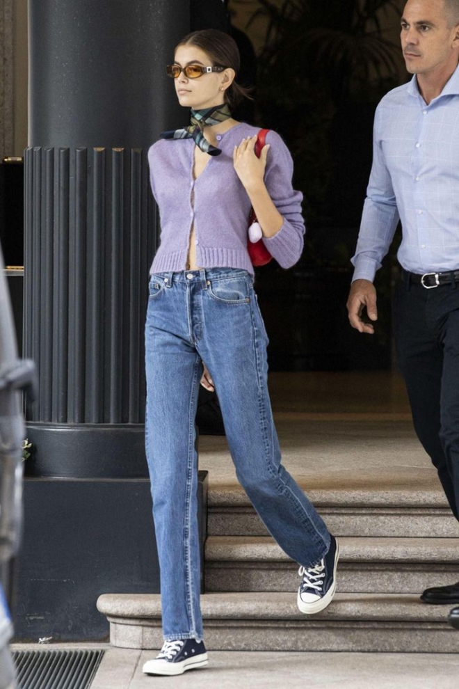 Sở hữu đôi chân dài vạn người mê nên Kaia rất chăm diện quần jeans. Cô thường mặc những chiếc quần dáng rộng hoặc dáng đứng vừa thoải mái lại vô cùng năng động. Và một trong những item được ái nữ nhà Cindy Crawford yêu thích để phối quần jeans chính là áo len cardigan dáng ngắn. Sự kết hợp giữa 2 món đồ quen mặt này mang đến cho Kaia diện mạo trẻ trung nhưng cũng vô cùng cổ điển