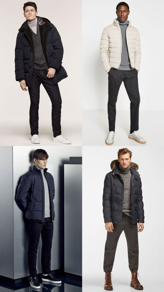 Áo phao nam kết hợp với áo len cổ lọ màu trung tính