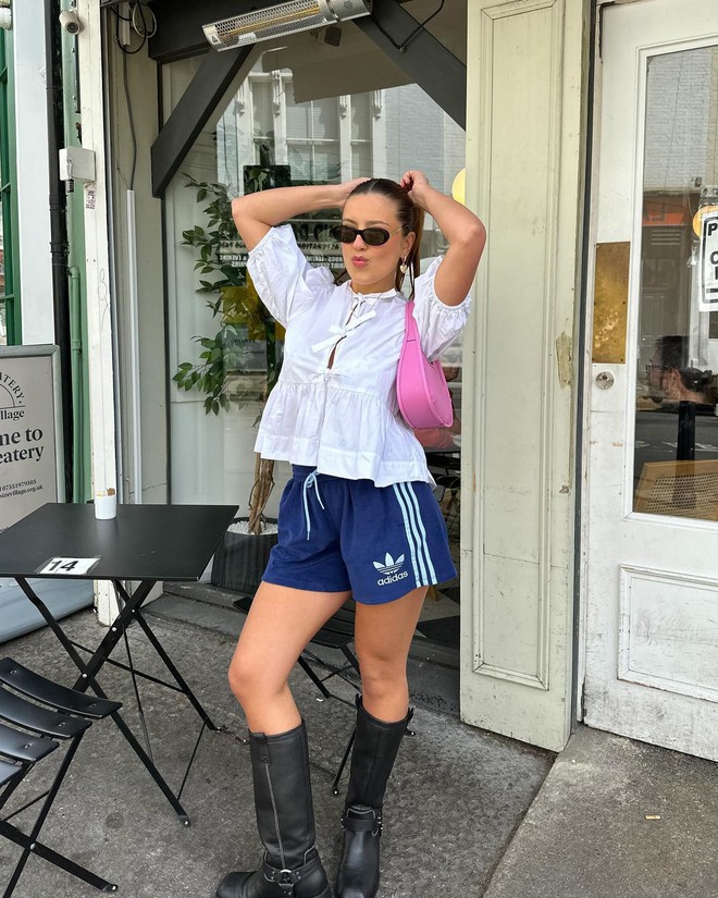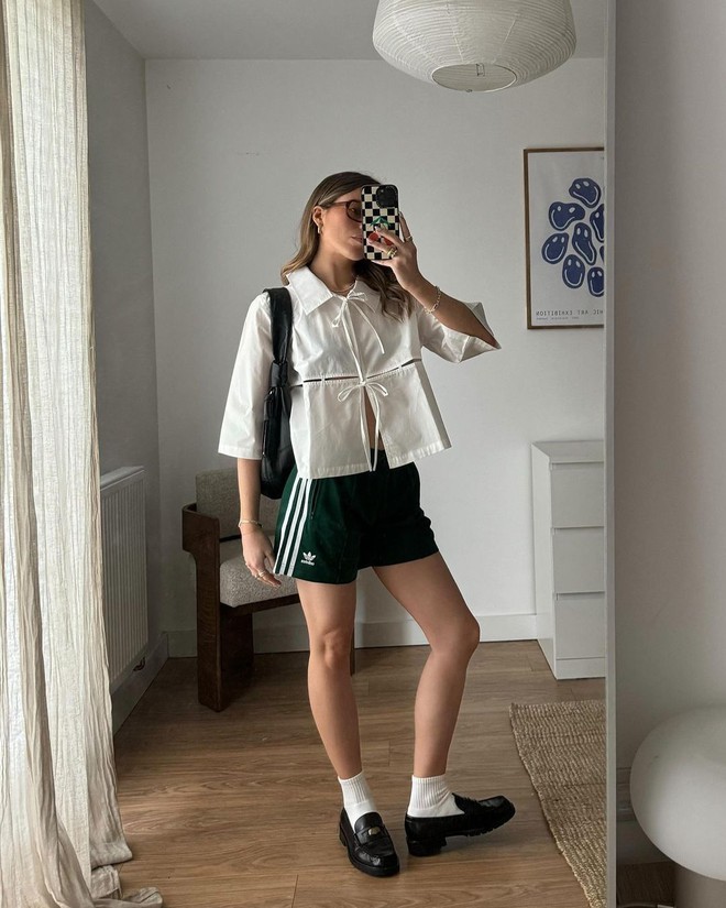 Theo quy tắc thông thường, những món đồ nơ thường được phối theo phong cách ngọt ngào, nữ tính. Tuy nhiên, ngoại lệ của năm nay - chiếc áo blouse thắt nơ đang được các cô nàng trendy mix nhiều nhất cùng những chiếc quần mang hơi hướng thể thao, năng động giúp tổng thể outfit tạo ra sự cân bằng thú vị.