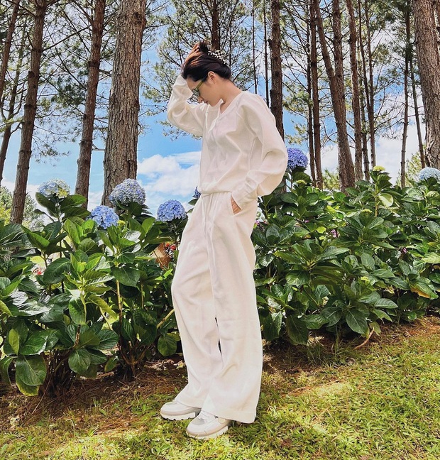 Không thích phối đồ cầu kỳ nhưng vẫn muốn có vẻ ngoài "cool ngầu", chị em hãy tham khảo set áo trắng và quần ống rộng của nữ ca sĩ sinh năm 1992. Đôi giày sneaker trắng và kiểu tóc kẹp càng cua là lựa chọn phù hợp để hoàn thiện phong cách.