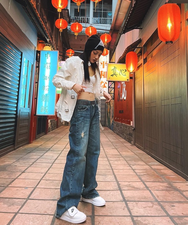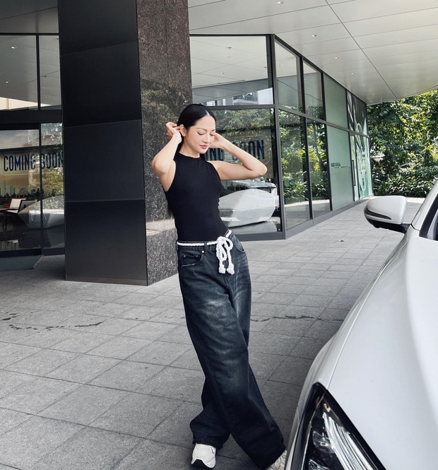 Bảo Anh cũng rất yêu thích phong cách bụi bặm và "cool ngầu". Nữ ca sĩ kết hợp áo tank top tông màu đen với quần jeans ống suông và giày sneaker trắng. Thao tác sơ vin là cần thiết vì giúp nâng tầm phong cách và tạo tỷ lệ vóc dáng đẹp.