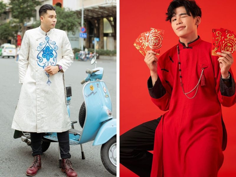 Sự kết hợp giữa áo dài cách tân nam và quần kaki sẽ phù hợp với những chàng trai thích sự đĩnh đạc, lịch sự và có phần trưởng thành hơn. Thích hợp để mặc vào các dịp lễ, tết, các sự kiện quan trọng.