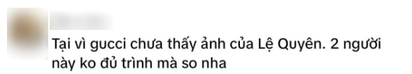 Và cũng như mọi lần, netizen lại có dịp so sánh với "cô bạn cũ từng thân" Hồ Ngọc Hà của Lệ Quyên. Thậm chí dưới bài đăng về việc tham dự show Gucci tại Milan của Hồ Ngọc Hà có netizen còn hài hước bình luận: "Tại vì Gucci chưa thấy ảnh của Lệ Quyên, 2 người này không đủ trình mà so".