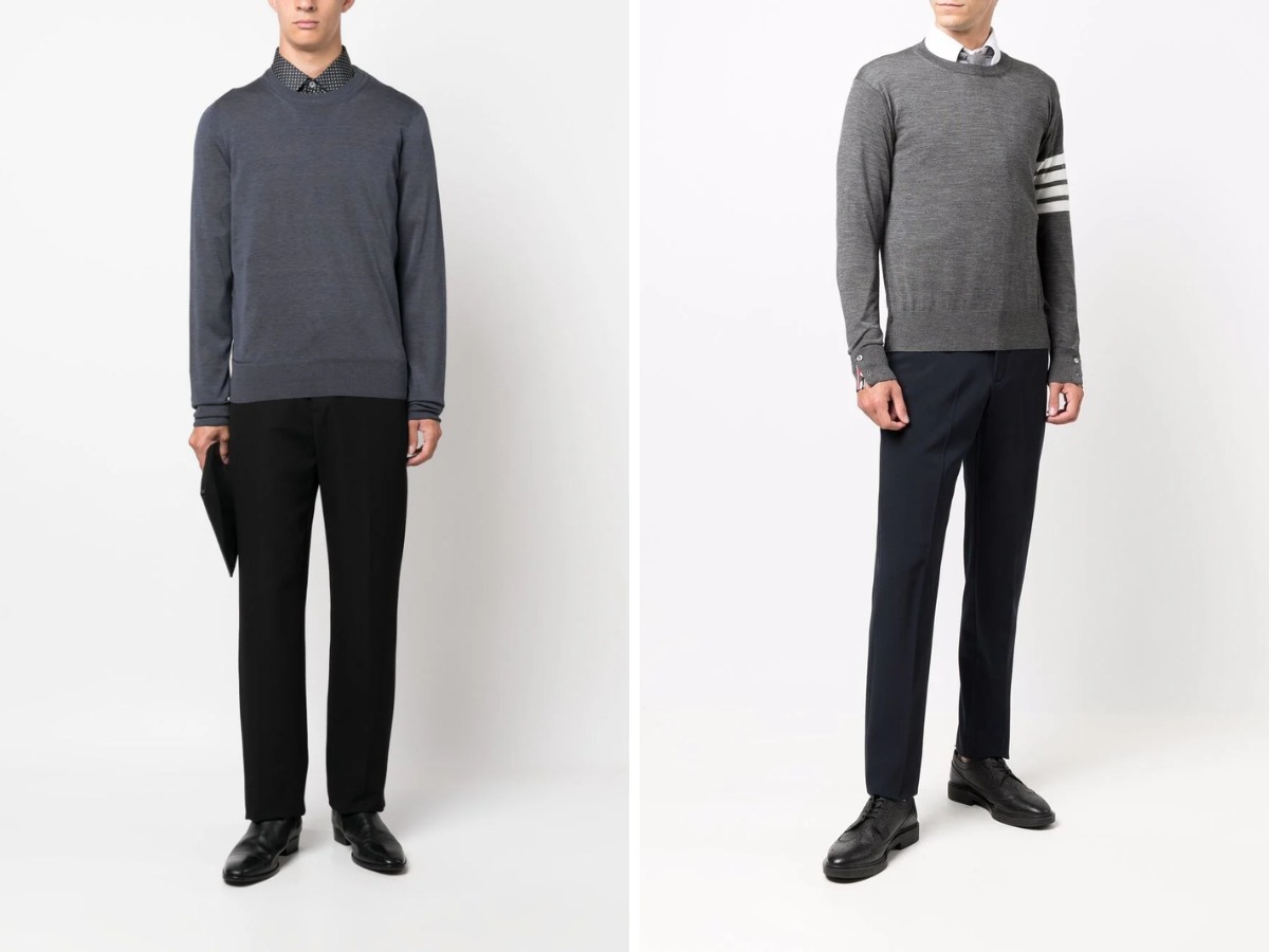 Với quần âu, bạn nên lựa chọn quần dáng slim ống nhỏ và chiều dài không quá mắt cá nhân. Áo len trơn hoặc họa tiết đơn giản như kẻ sọc, kẻ viền, … sẽ là “mảnh ghép” hoàn hảo cùng quần âu. Bên cạnh đó, có thể sơ vin áo len hoặc không đều được. Phong cách này nhìn chung giúp bạn trông cao ráo hơn cho dù trong hoàn cảnh nào.