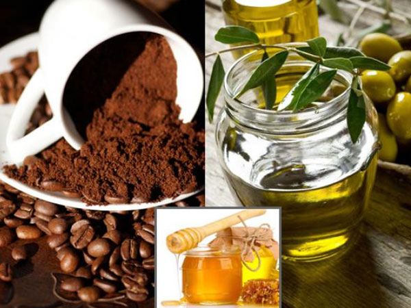 Nguyên liệu cần chuẩn bị: 2 muỗng mật ong nguyên chất, 2 muỗng dầu ô liu nguyên chất, 2 muỗng đường cát trắng và 2 muỗng bã cà phê.