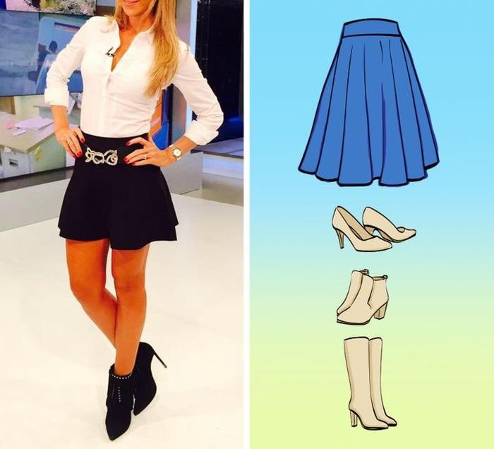 Nhưng đôi khi, tùy vào dáng người, phần chân váy loe ra có thể làm bạn trông thấp đi vì thế bạn nên đi giày cao gót. Bạn có thể chọn độ cao và kiểu giày tùy theo sở thích của mình.