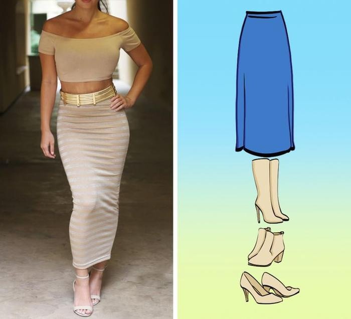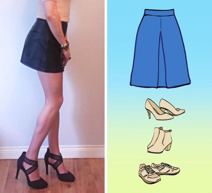 Váy chữ A rất dễ thương nhưng đôi lúc nó cũng khiến chân bạn trông ngắn hơn và phần hông rộng hơn. Vì vậy, những đôi giày cao gót cao hoặc vừa tầm là lựa chọn tốt nhất nếu bạn muốn tạo dáng thanh mảnh.