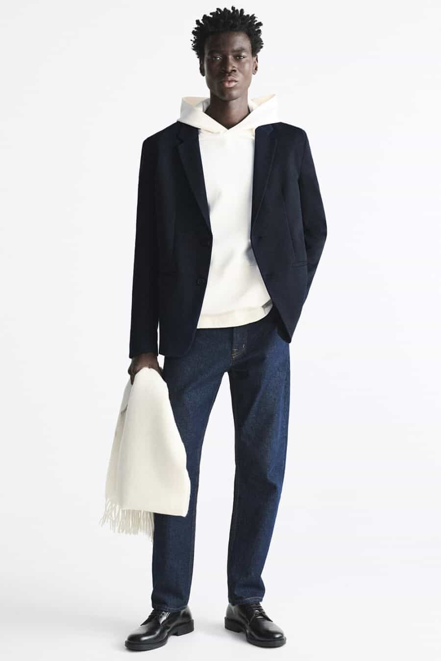 3. Quần jeans với hoodie trắng và blazer xanh navy