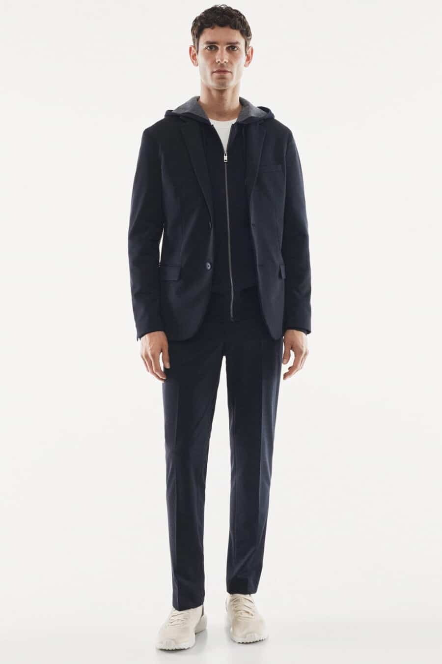 Màn kết hợp giữa bộ suit màu xanh navy và áo hoodie cùng màu mang đến sự liền mạch cho bộ trang phục, mặc dù bạn sẽ thấy chúng ở hai phía đối lập nhau. Cả hai yếu tố giữa casual và lịch sự đều thoải mái, tối giản và vừa vặn, mang lại vẻ ngoài thanh lịch đơn giản.