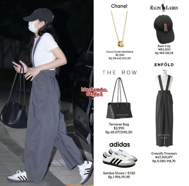 Jennie lựa chọn set đồ vô cùng rộng rãi, thoải mái với áo phông trắng cùng yếm màu xám trendy. Nữ idol đã gia tăng sự cá tính, thời thượng cho trang phục khi kết hợp cùng giày sneaker và mẫu túi đen kiểu dáng đơn giản. Chiếc vòng cổ Coco Crush Necklace của Chanel với giá trị hơn 60 triệu đồng chính là điểm nhấn cực kỳ nổi bật trong set đồ của Jennie. Tổng thể trang phục của cô nàng có giá trị khoảng 136 triệu đồng.
