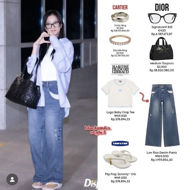Chị cả Jisoo lại lựa chọn trang phục basic, casual khi phối áo phông với quần jeans cùng áo sơ mi oversize khoác ngoài. Đặc biệt, nữ idol cũng "bắt trend" cực nhanh với đôi dép xỏ ngón hot hit, xinh xắn. Điểm nhấn của outfit chính là "em" túi Dior Medium Toujours cùng bộ đôi trang sức cao cấp của Cartier giúp nàng đại sứ thêm phần sang trảnh, nổi bật. Nữ thần tượng cũng khiến fan mê mẩn khi diện thêm chiếc kính Dior đầy đáng yêu, nhí nhảnh. Set đồ của Jisoo cực đắt đỏ, có giá trị lên đến 361 triệu VNĐ