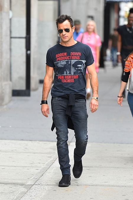 Còn món đồ nào khéo léo để khoe bắp tay săn chắc, vẻ ngoài nam tính của quý ông hơn một chiếc áo thun ôm. Hãy học cách nam tài tử Hollywood Justin Theroux xắn tay áo phông của mình. Dùng bàn tay nhẹ nhàng xắn phần gấu tay áo một cách gọn gàng lên khoảng từ hai đến ba phân là đủ.
