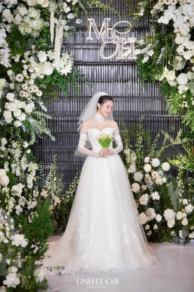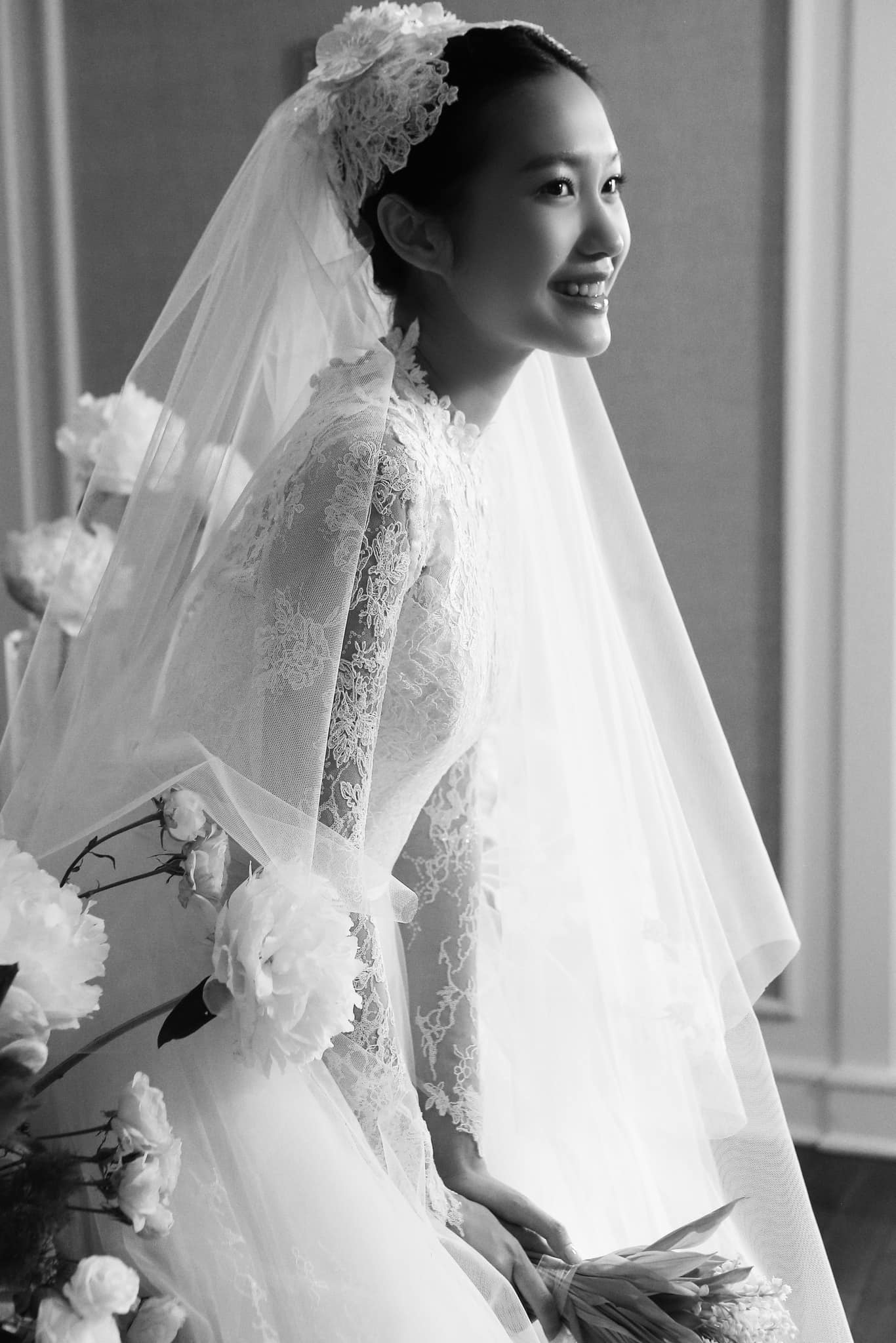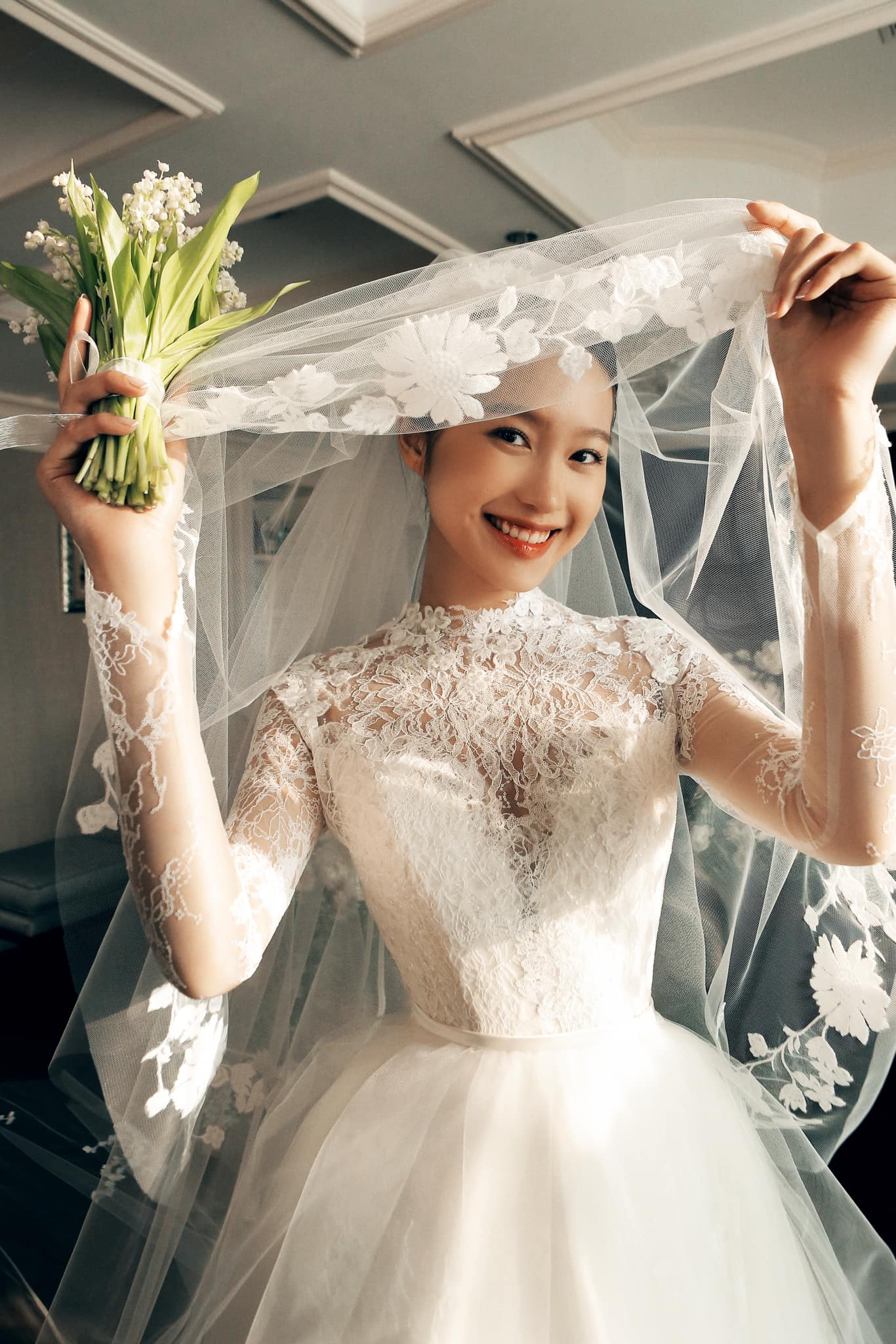 Khi bước lên lễ đường, Doãn Hải My chọn bộ váy cưới kín đáo, phủ ren tinh xảo, thể hiện nét sang trọng, tinh khôi và không kém phần quyến rũ.