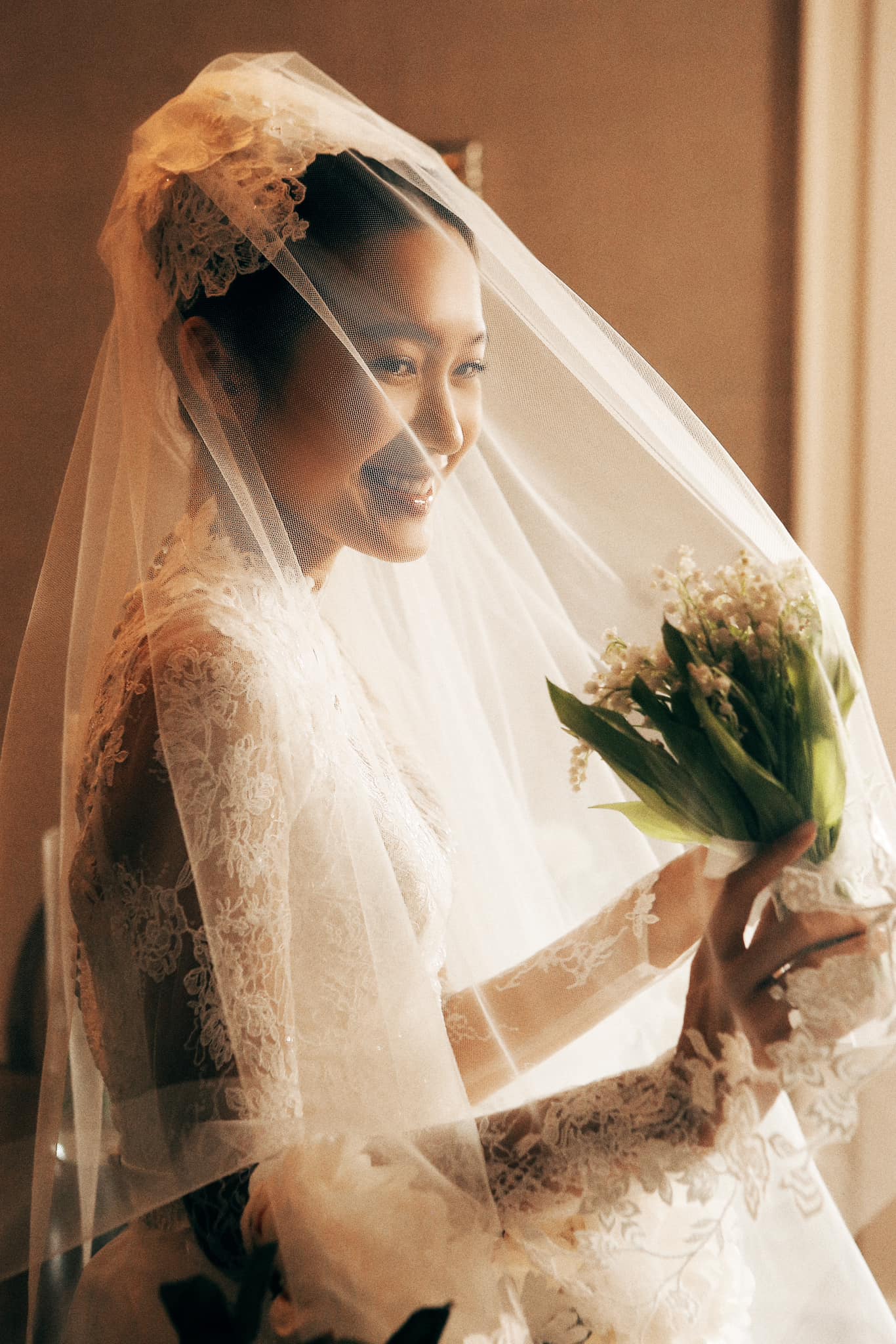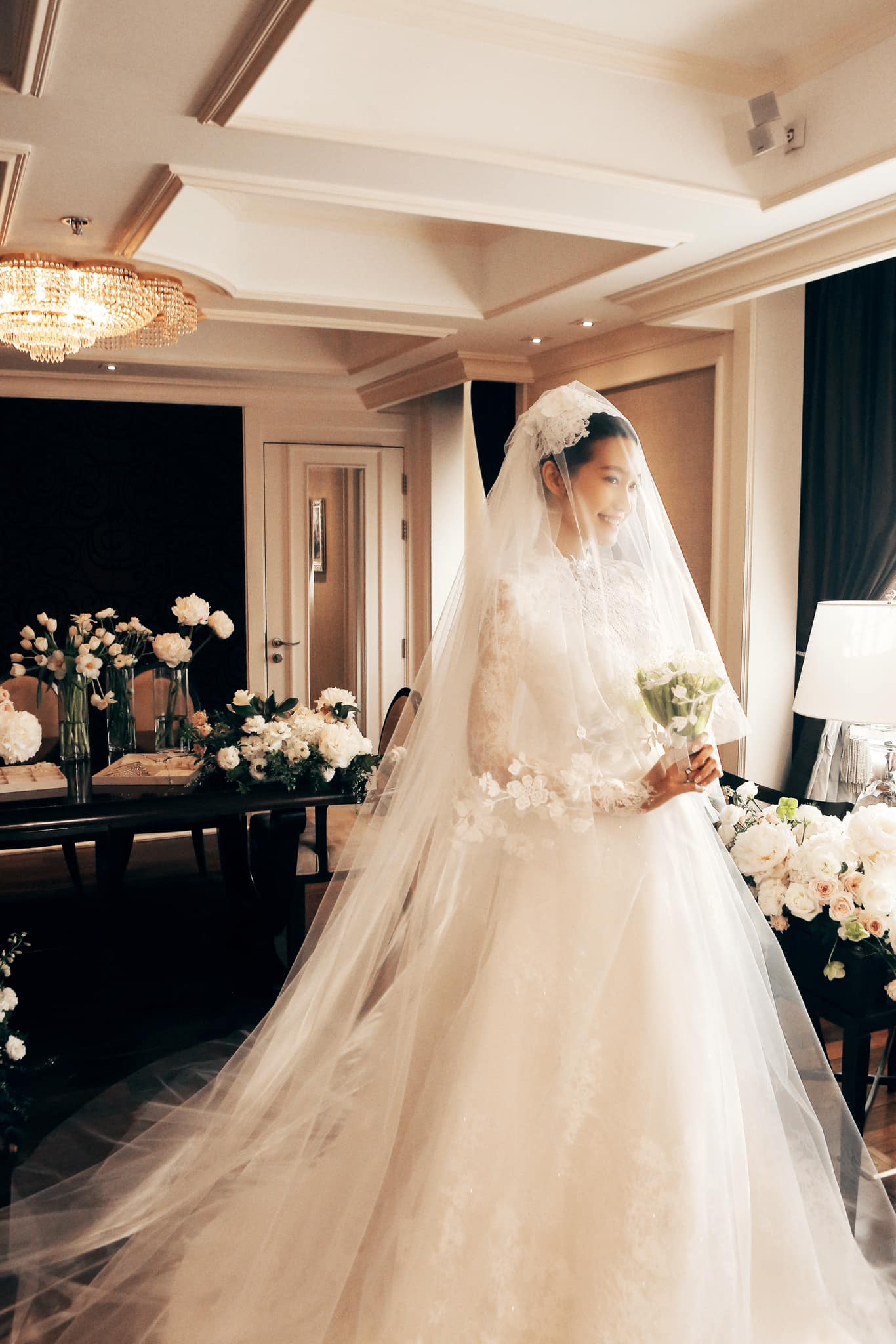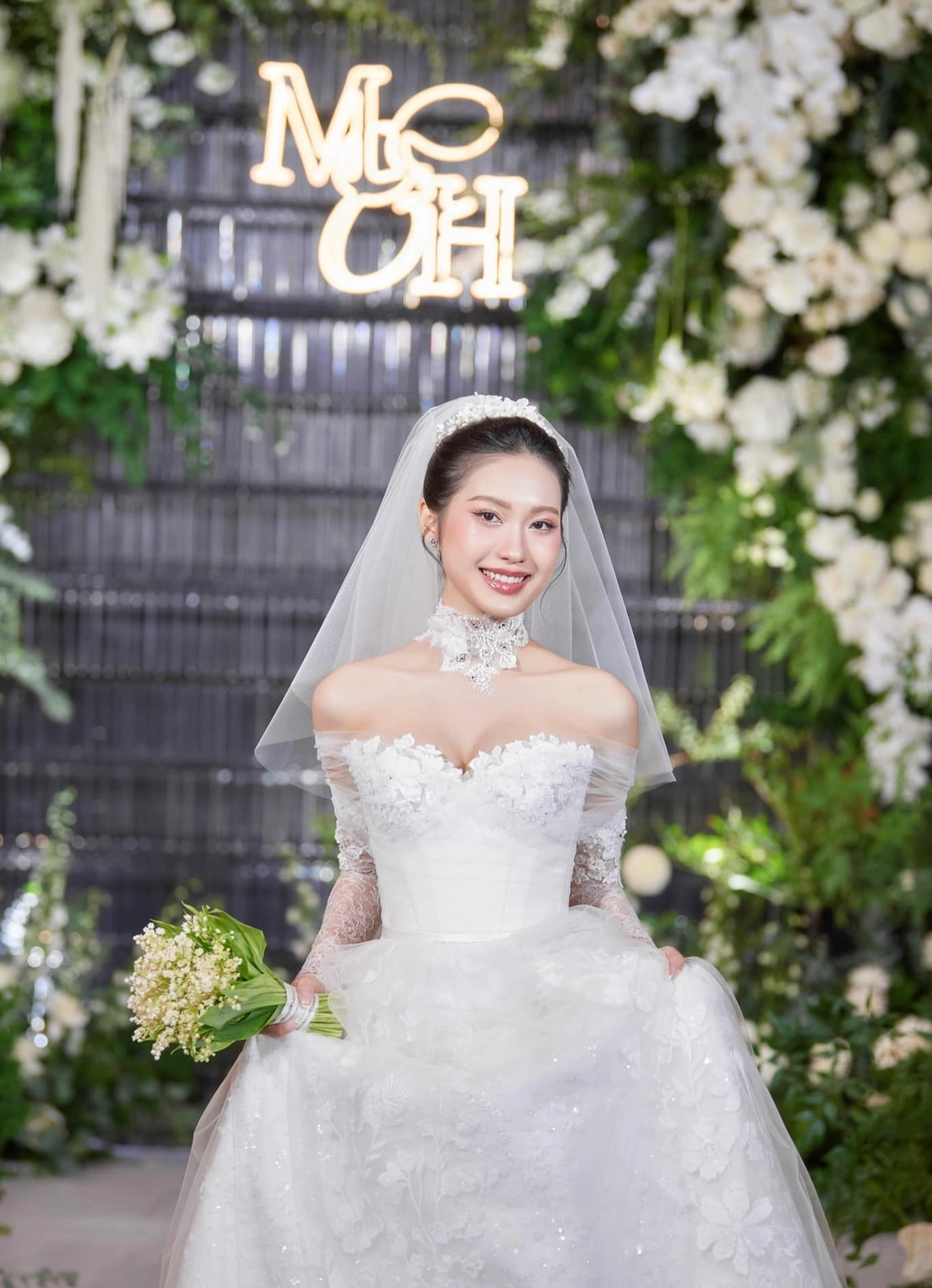 Khi bước lên lễ đường, Doãn Hải My chọn bộ váy cưới kín đáo, phủ ren tinh xảo, thể hiện nét sang trọng, tinh khôi và không kém phần quyến rũ.
