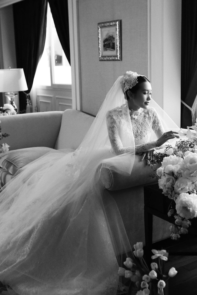 Thêm một điểm ấn tượng của Doãn Hải My trong tạo hình này là voan đội đầu được làm vô cùng cầu kỳ với hàng chục bông hoa vải kết thành chùm. Chi tiết này giúp Doãn Hải My nhìn khác biệt so với các cô dâu khác thường đội vương miện.