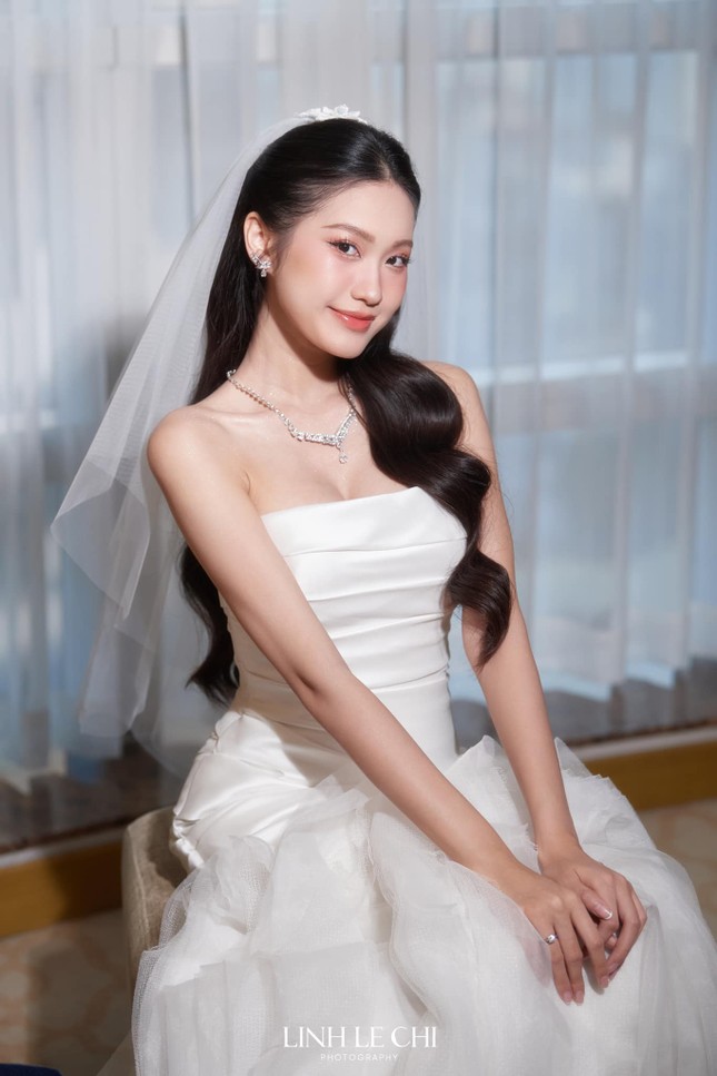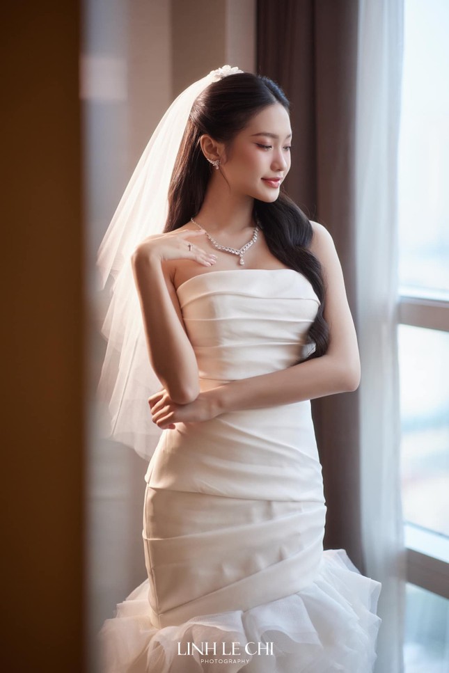 Chiếc váy dáng ôm sát đã giúp cô dâu khoe thân hình "mình hạc xương mai" trong ngày trọng đại. Để giữ nét tinh tế cho tổng thể, người đẹp Hà thành chọn trang sức bản nhỏ, không cầu kỳ