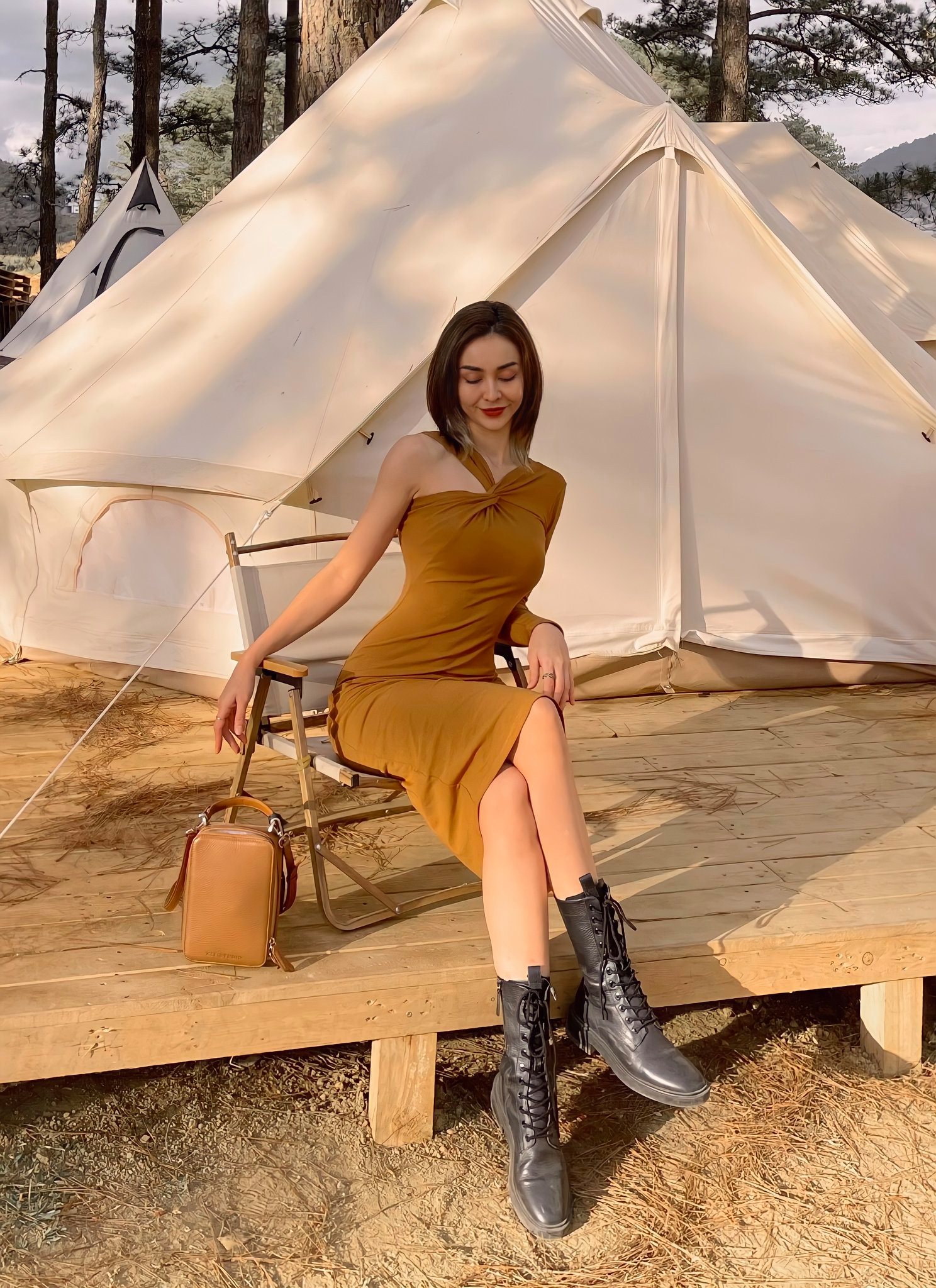 Mẫu váy lệch vai của MLee vừa nữ tính, vừa thời thượng và nổi bật. Tổng thể trang phục thêm ấn tượng khi MLee kết hợp mẫu váy cùng đôi boots buộc dây. Chiếc túi xách mang tông màu nâu rất phù hợp với bộ cánh vì giúp đảm bảo sự tinh tế, trang nhã cho outfit.