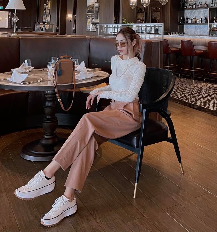 Trẻ trung nhưng vẫn tinh tế là ưu điểm của set trang phục gồm áo trắng dài tay kết hợp với quần ống đứng, mang tông màu be. Để đảm bảo sự trang nhã của bộ đồ nhưng không làm giảm đi nét năng động, MLee đã khéo léo chọn một đôi sneaker trắng.