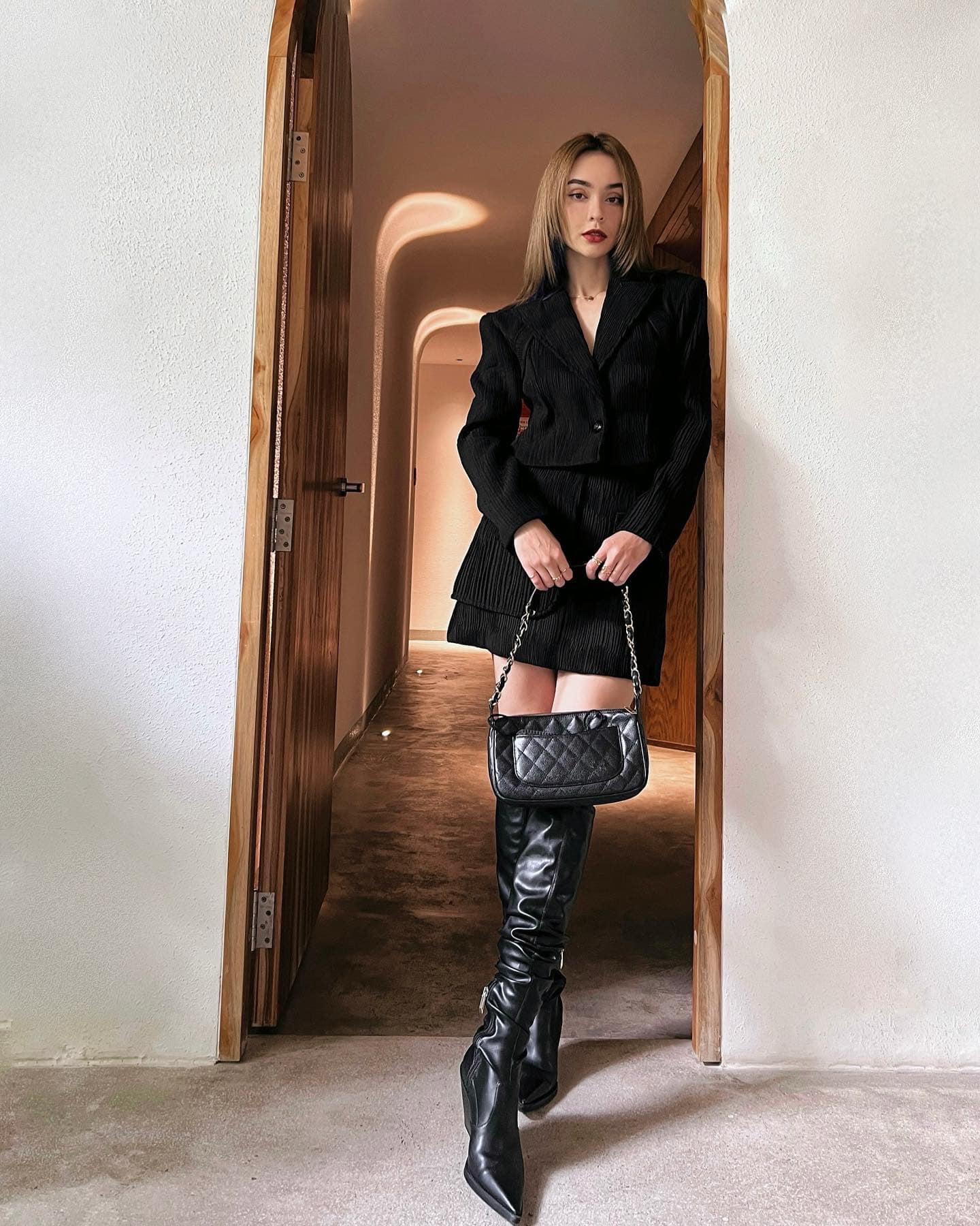MLee ghi điểm thanh lịch và sang trọng khi diện set áo blazer và quần short đồng bộ, mang tông màu đen. Tổng thể trang phục trở nên long lanh, nổi bật hơn nhờ đôi boots cao cổ. MLee còn gợi ý tuyệt chiêu giúp nâng tầm diện mạo khi diện trang phục màu đen, đó là tô son môi đỏ đậm.