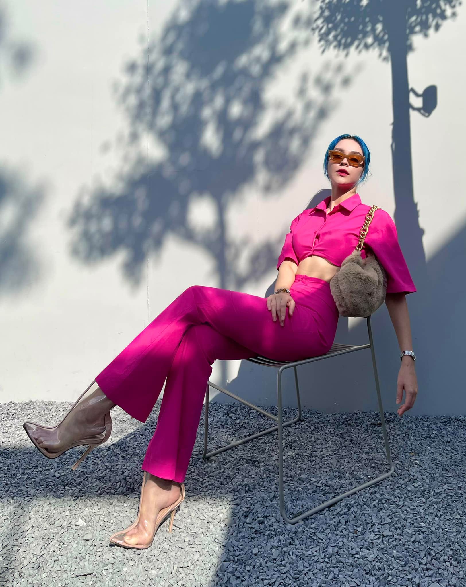 Set đồ đồng bộ mang tông màu hồng đậm của MLee đã tôn lên làn da tươi sáng, rạng rỡ của nữ ca sĩ. MLee còn tăng thêm sự nổi bật và thời thượng cho outfit bằng cách tô điểm một chiếc túi xách phủ lông và đeo kính mắt "cool ngầu".