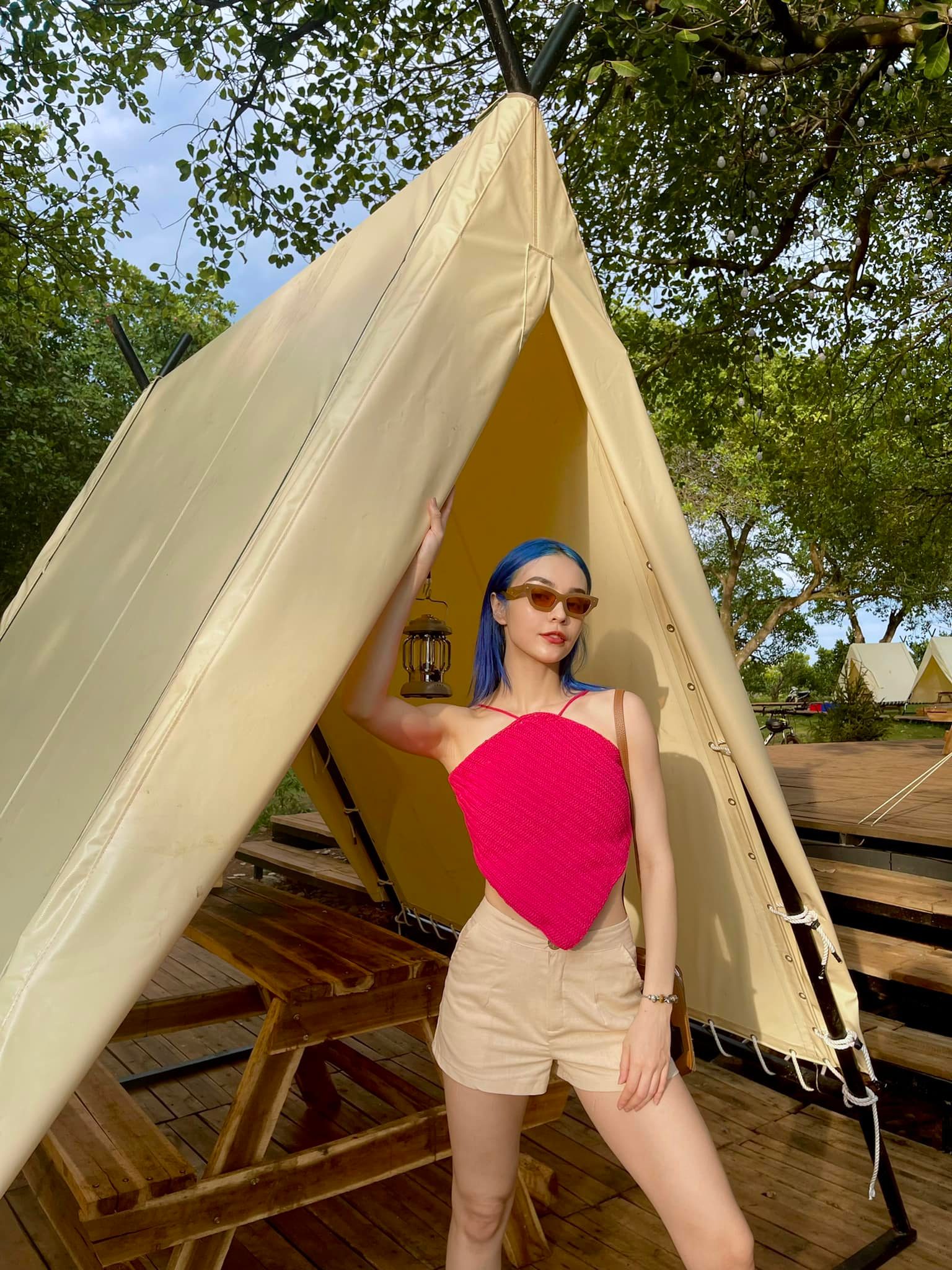 MLee gợi ý cho chị em bộ trang phục màu sắc chuẩn sành điệu, đó là công thức áo cổ yếm màu hồng đậm và quần short màu be. Set trang phục này rất trẻ trung nhưng vẫn có sự hài hòa, sang xịn mịn.