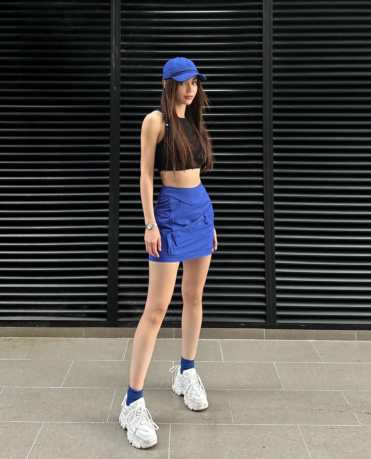MLee rất thích diện trang phục màu sắc. Điều này giúp phong cách của nữ ca sĩ trở nên nổi bật, trẻ trung chứ không bị nhàm chán. Set đồ gồm áo crop top màu đen và chân váy xanh đậm ghi điểm ở sự năng động, tươi trẻ. Bên cạnh đó, bộ trang phục vẫn có sự hài hòa. Các món phụ kiện như mũ lưỡi trai, giày sneaker trắng rất "ăn nhập" với set đồ cá tính.