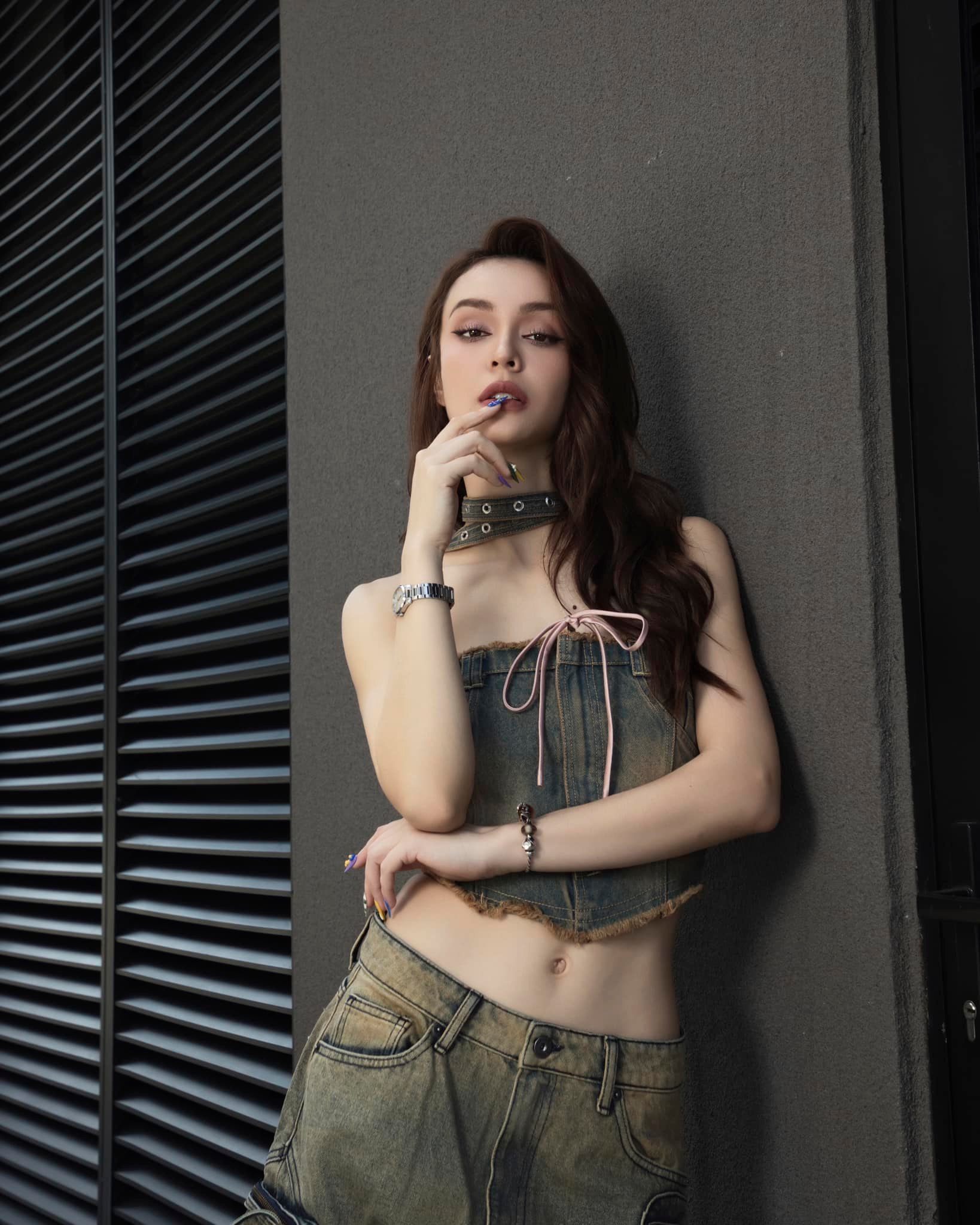 Set đồ gồm áo crop top và quần denim đồng bộ của MLee đã mang đến cho người diện nét trẻ trung, bụi bặm. Bên cạnh đó, set đồ này còn tôn lên được nét quyến rũ của MLee. Muốn tạo sự đột phá cho thời trang dạo phố, outfit trên là gợi ý hoàn hảo cho chị em.
