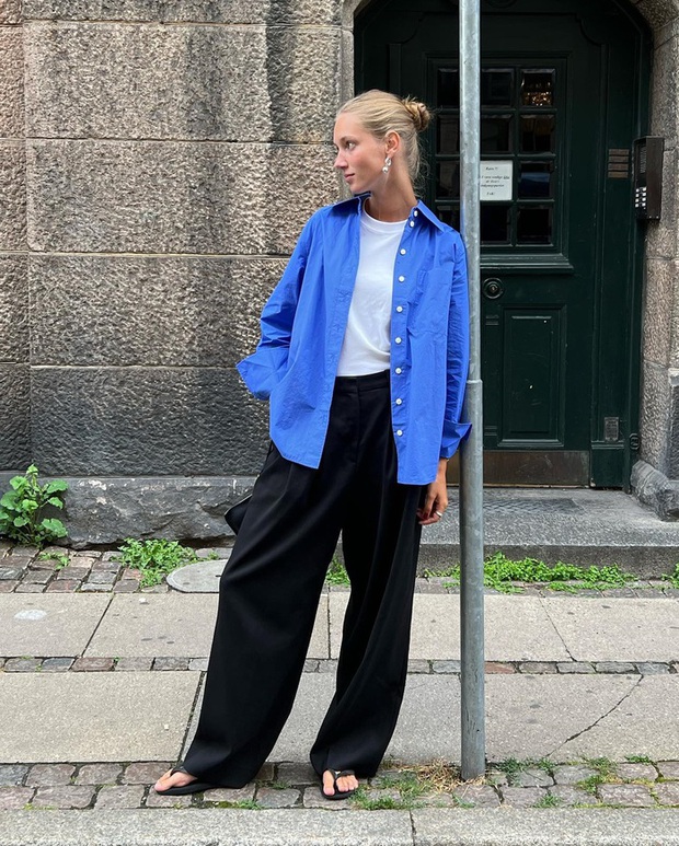 Những set đồ layer là lựa chọn hoàn hảo cho mùa thu. Chiếc áo sơ mi màu xanh da trời đã "thắp sáng" bộ đôi áo thun trắng và quần âu đen, giúp vẻ ngoài của người diện thêm nổi bật. Để không bị "dìm" dáng khi diện các bộ trang phục nhiều lớp, chị em nên sơ vin gọn gàng.